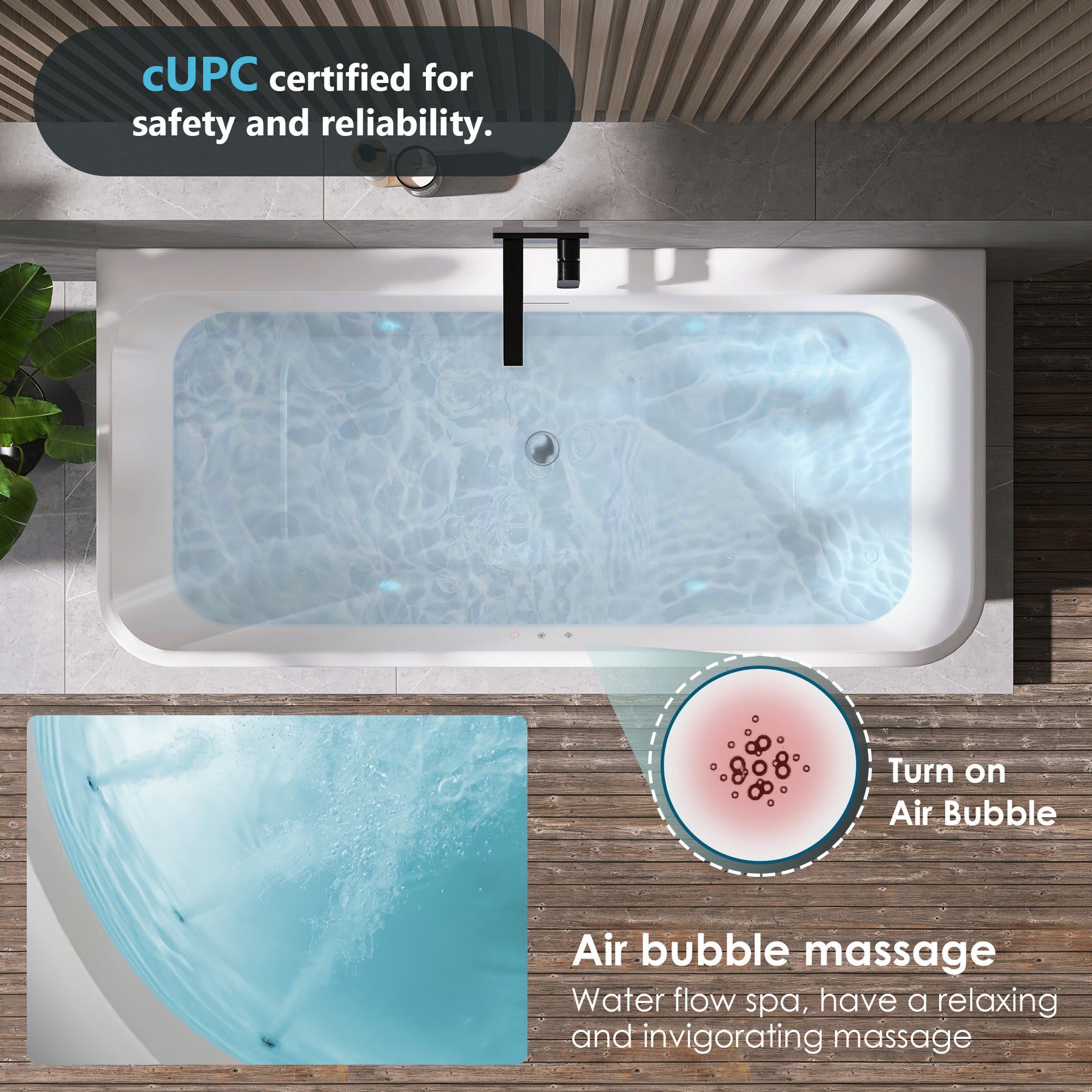 Want to transform your bathroom into your personal spa sanctuary? Make it happen with our Lilac Freestanding Bathtub—a marvel of modern style and smart form. This sleek, generously sized tub has a back-to-wall design that maximizes space, making it ideal for both large and small rooms. The innovative air bubble massage feature, accompanied by calming, multicolored LED lighting, creates a tranquil atmosphere, allowing you to unwind in a cascade of bubbles that gently caress and relax your entire body.