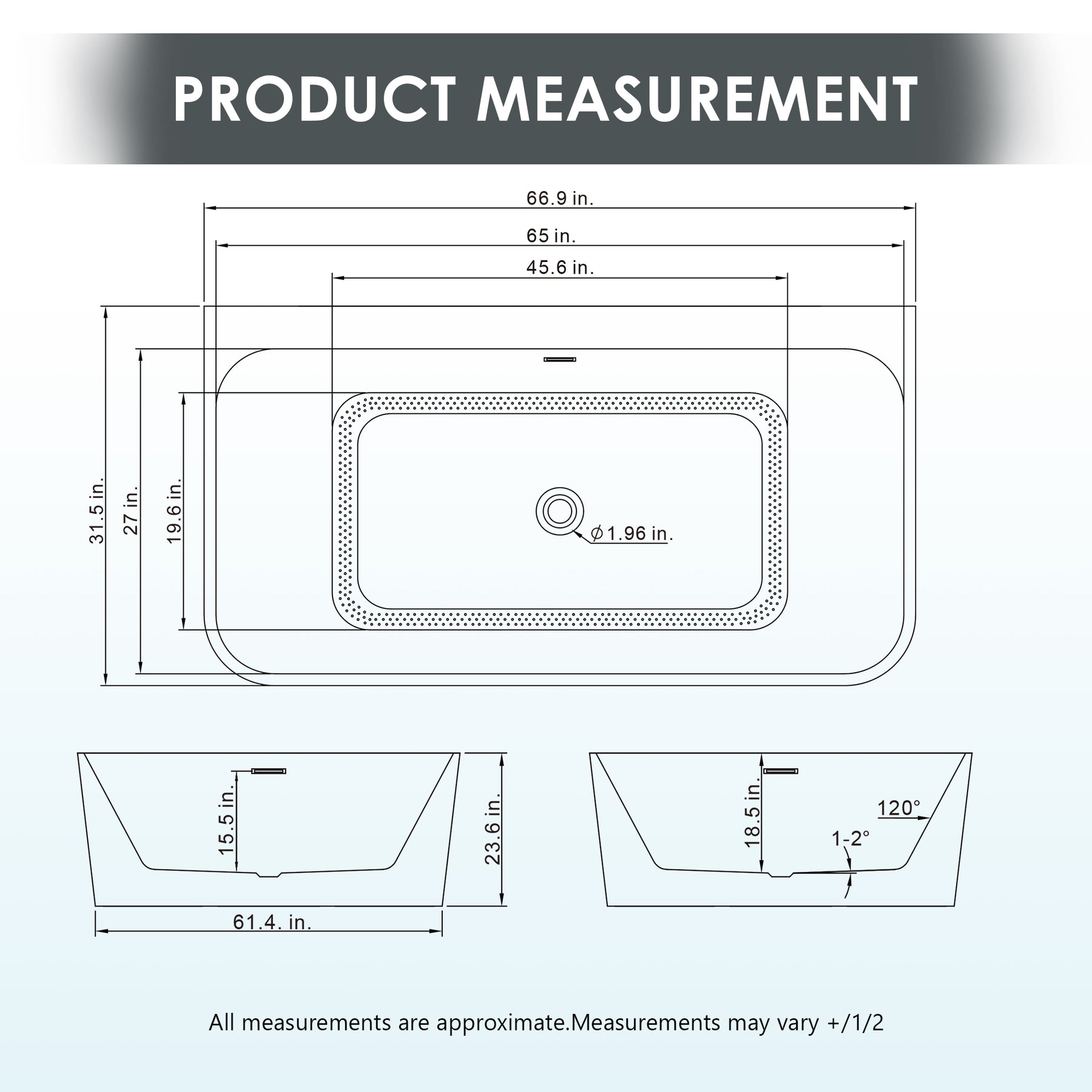 • Bathtub Only Dimensions (HxWxD)(in): H 23.6 x W 66.9 x D 31.5"