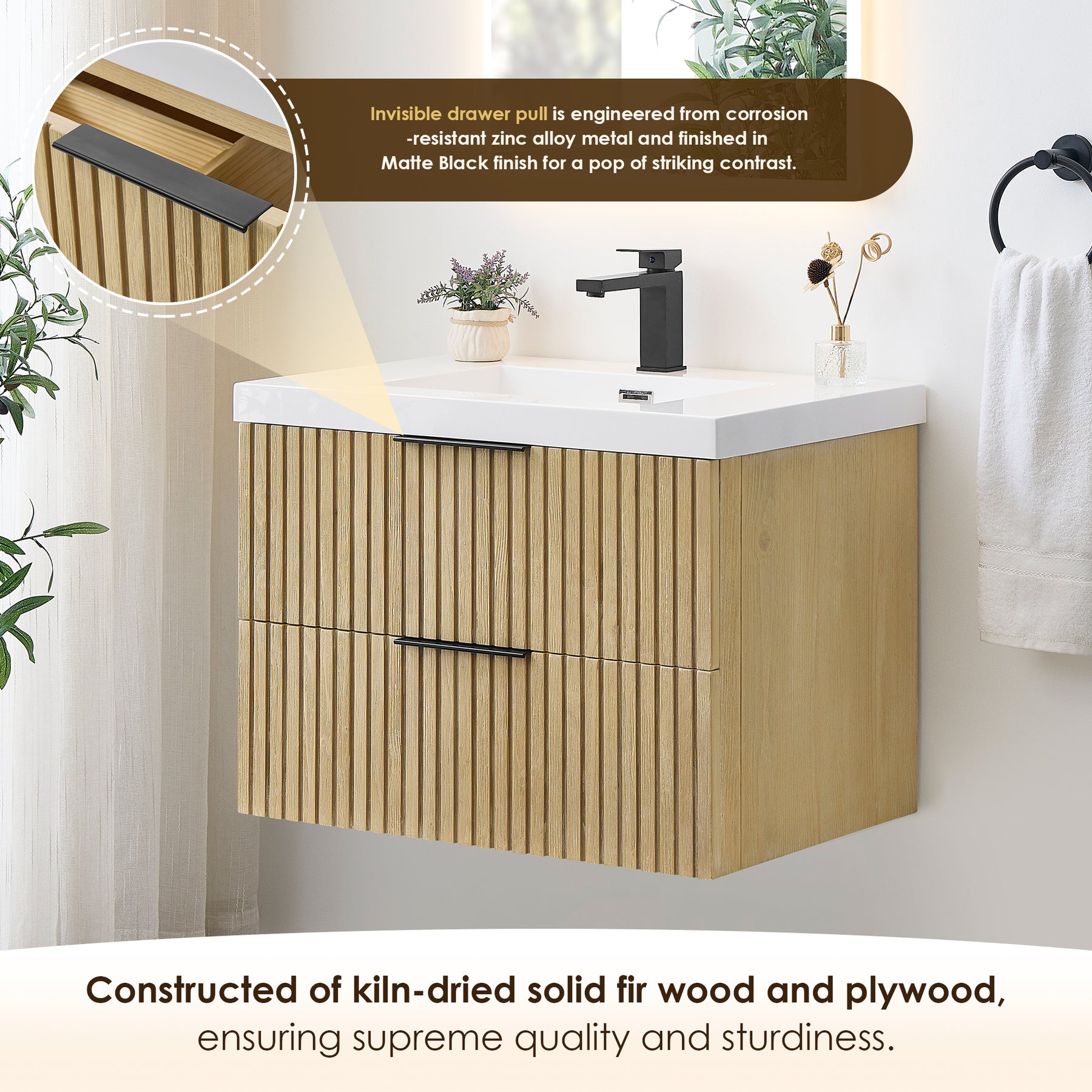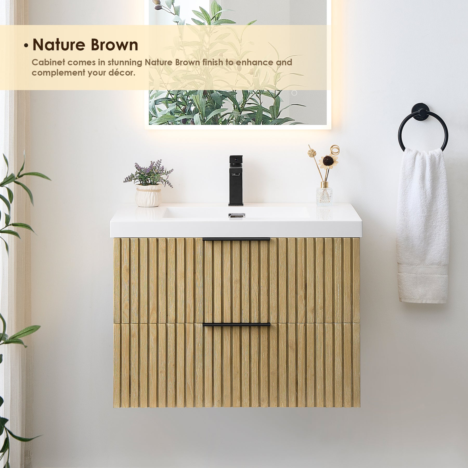 Textural and eye-catching, our Livia vanity features a Nature Brown Fir Wood finish that radiates a natural and warm ambiance. Vertical pieces of solid wood create a liner, clean, and minimalist pattern that integrates perfectly into the cabinet. Its fluted drawer fronts give this piece texture, depth, and character- perfect for a bathroom refresh. The wall-mounted design, built-in partitions, and built-in bridge drawers provide ample storage space for your bathroom essentials. The elegant white integrated artificial drop-in sink is aesthetically pleasing and easy to maintain, offering a convenient user experience.