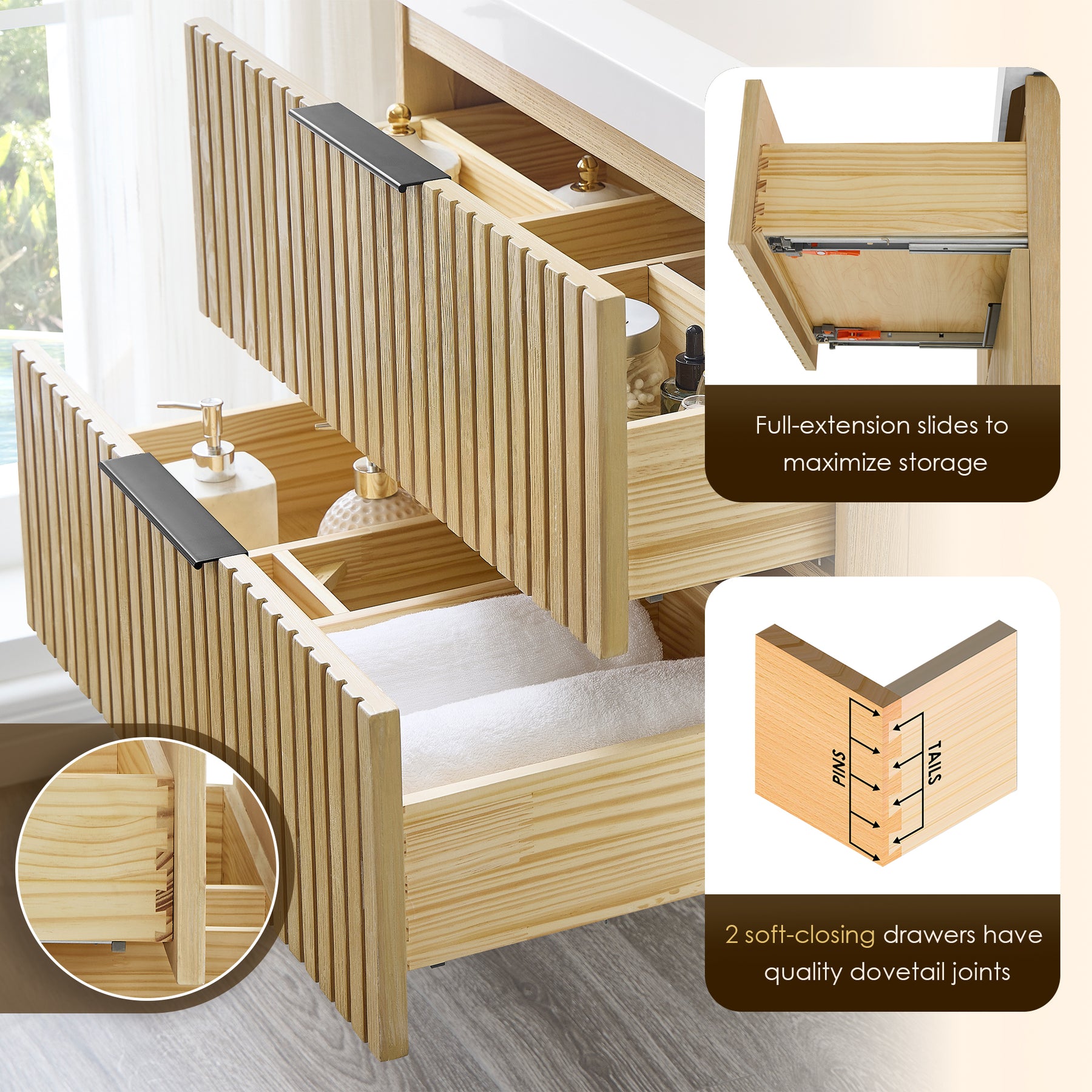 Ceramic Basin: 2 soft-closing drawers with dovetail joints offer ample space for all your grooming essentials.
