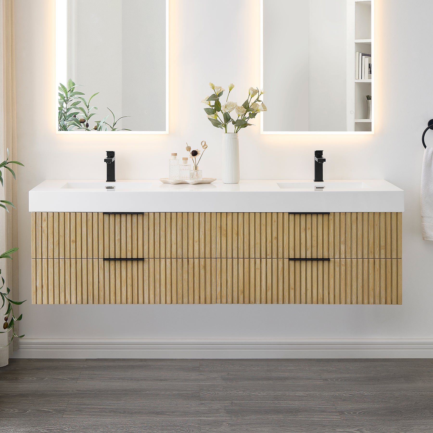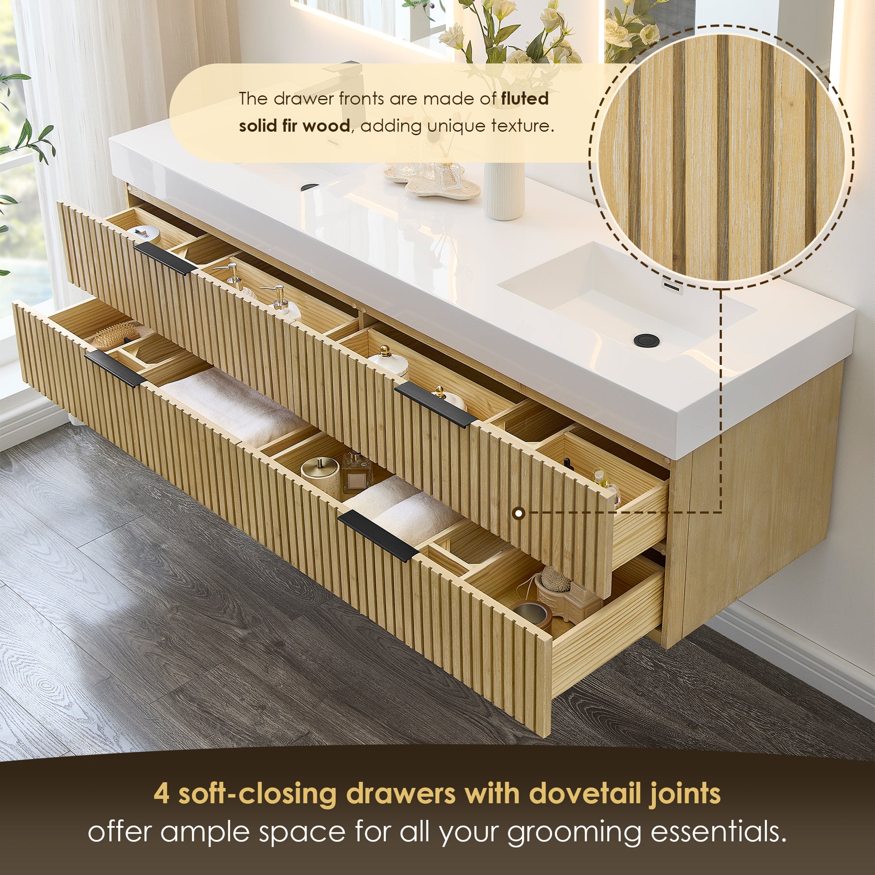 Textural and eye-catching, our Livia vanity features a Nature Brown Fir Wood finish that radiates a natural and warm ambiance. Vertical pieces of solid wood create a liner, clean, and minimalist pattern that integrates perfectly into the cabinet. Its fluted drawer fronts give this piece texture, depth, and character- perfect for a bathroom refresh. The wall-mounted design, built-in partitions, and built-in bridge drawers provide ample storage space for your bathroom essentials. The elegant white integrated artificial drop-in sink is aesthetically pleasing and easy to maintain, offering a convenient user experience.