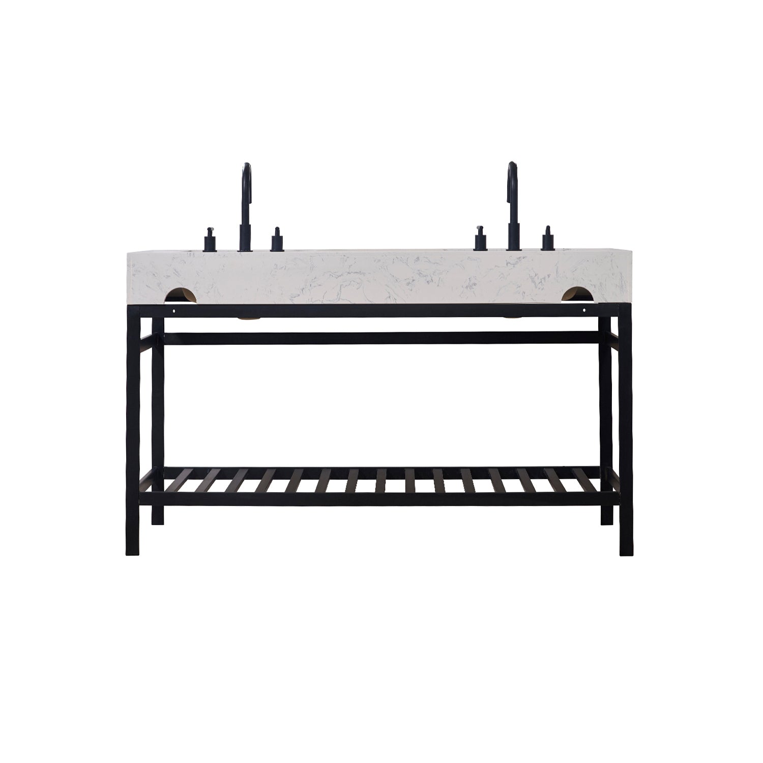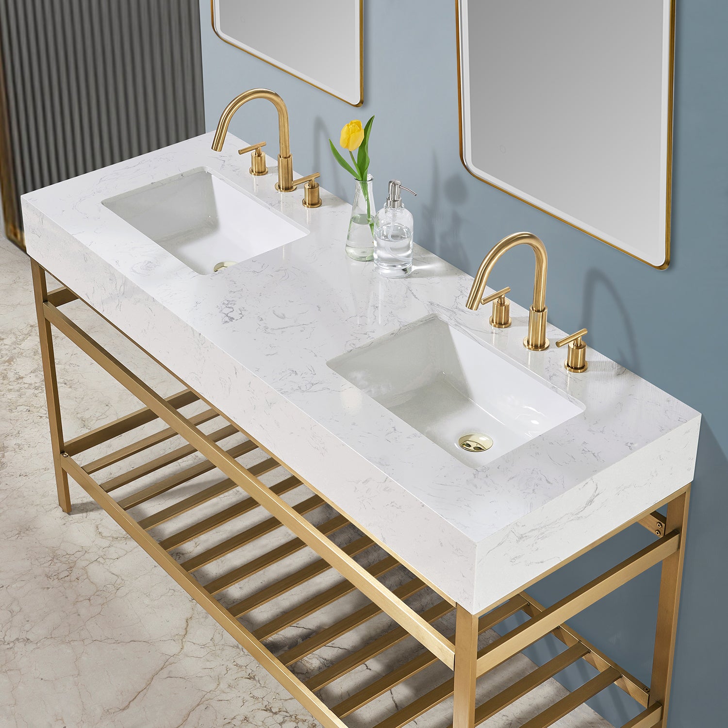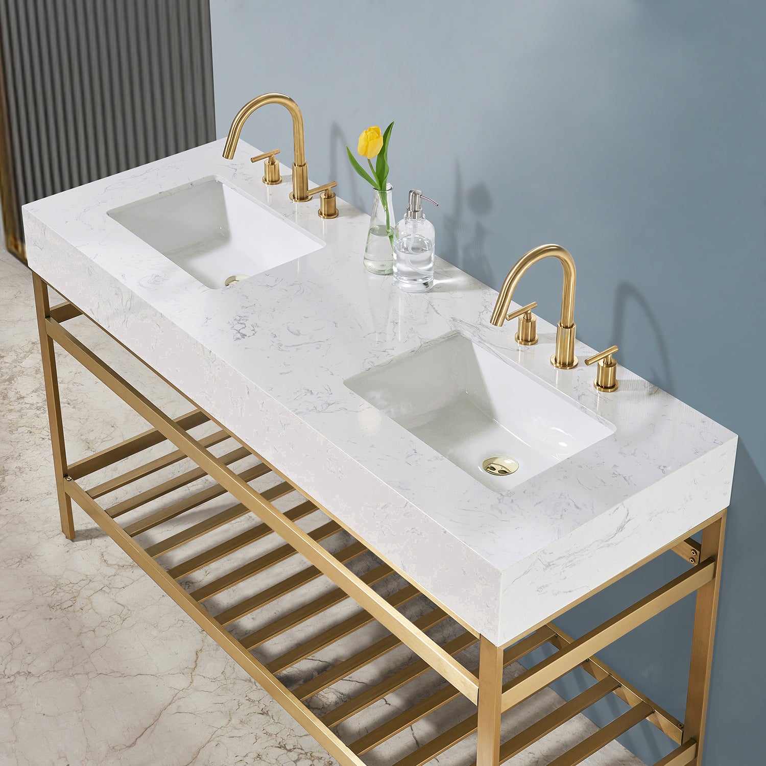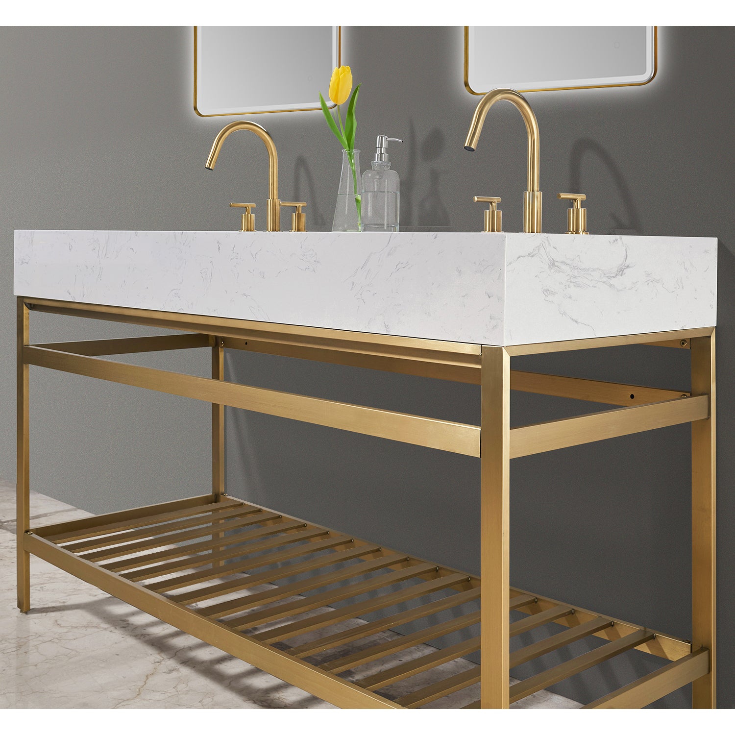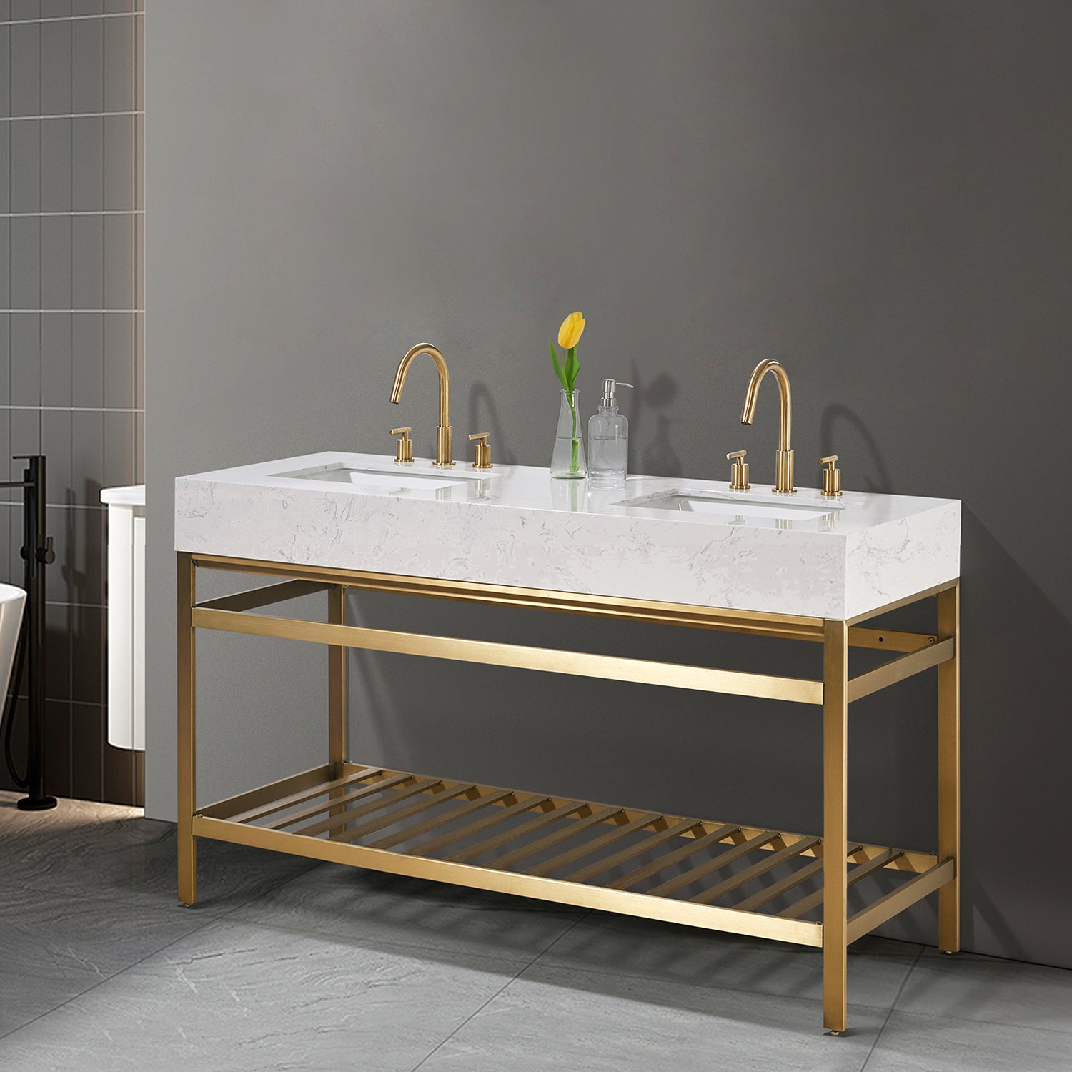 Looking for an elegant addition to your contemporary décor? Our Merano Stainless Steel Console Vanity blends the simple aesthetic of a pedestal sink with the sturdiness of a wall-mounted model. With flawless clean lines, it features a stylishly thick countertop crafted of premium composite stone with delicate veining. The open shelving below is the perfect place to stash plush towels and toiletries.