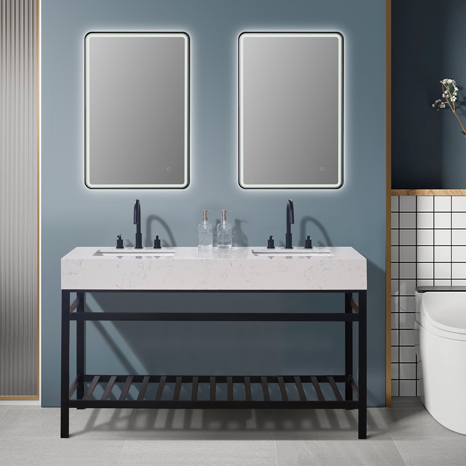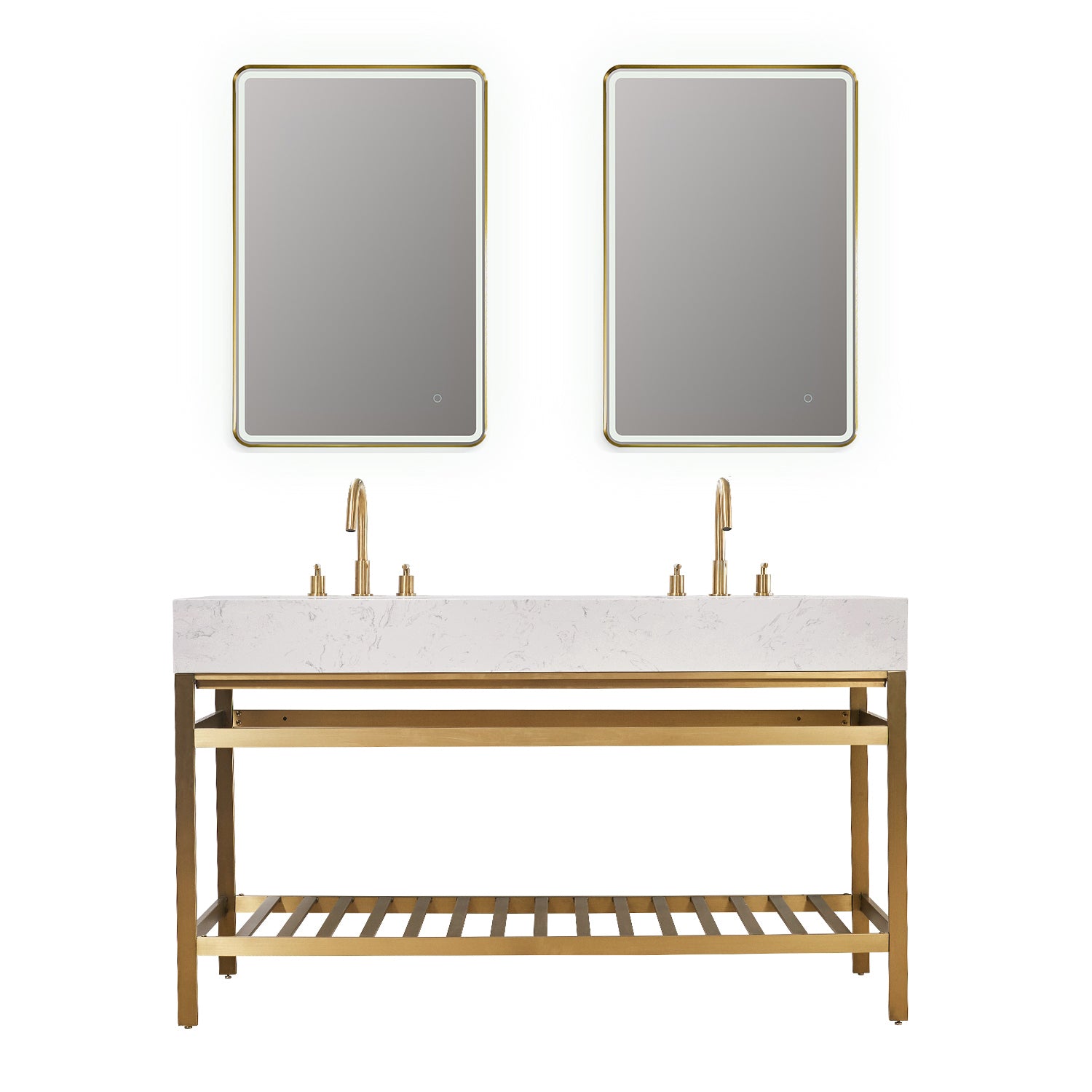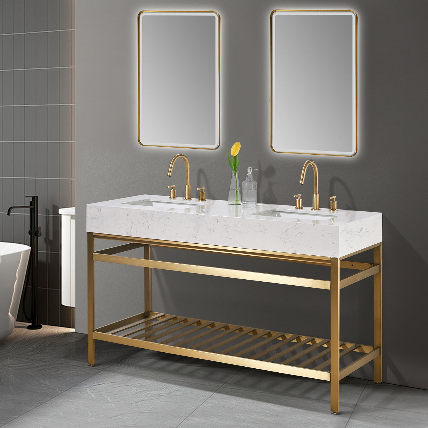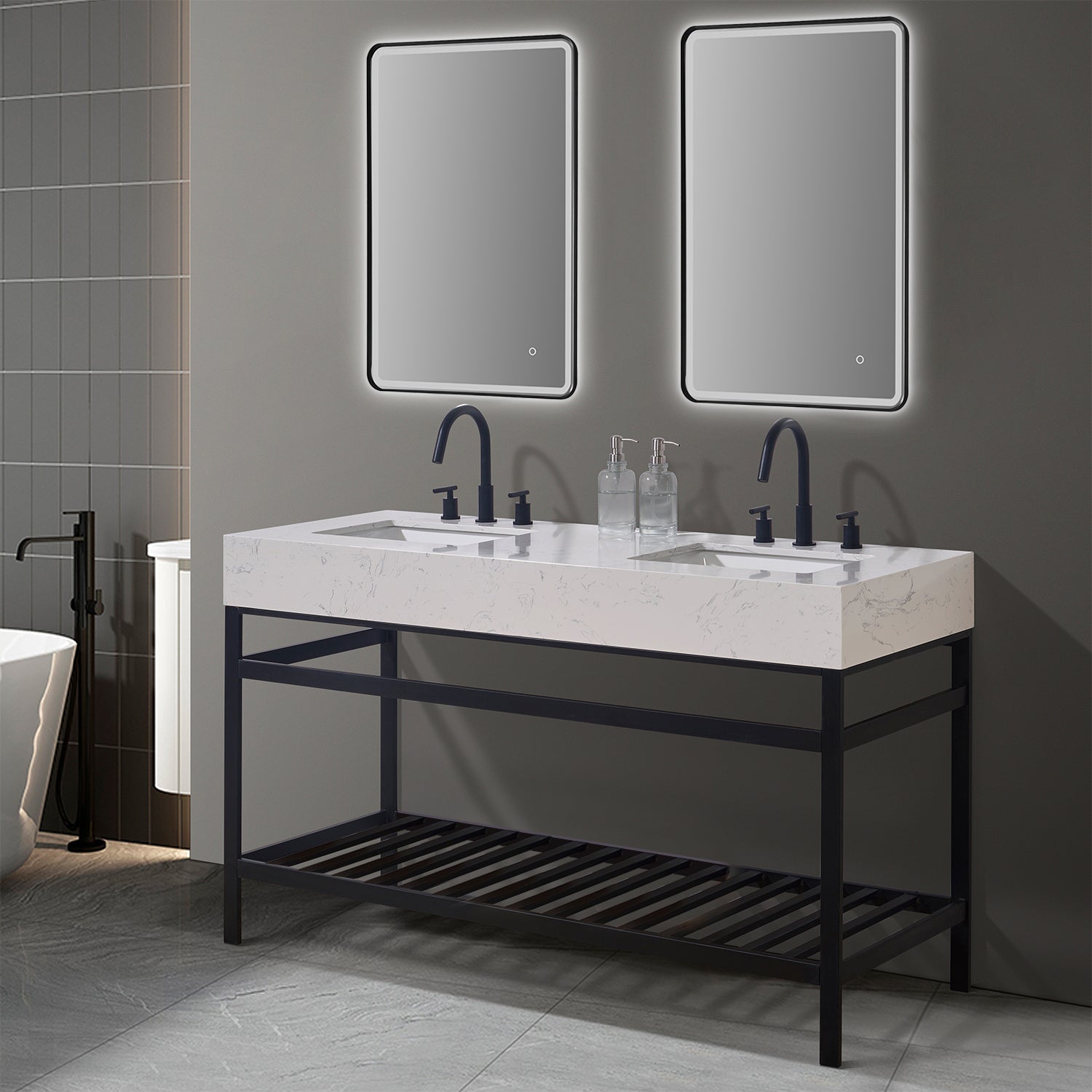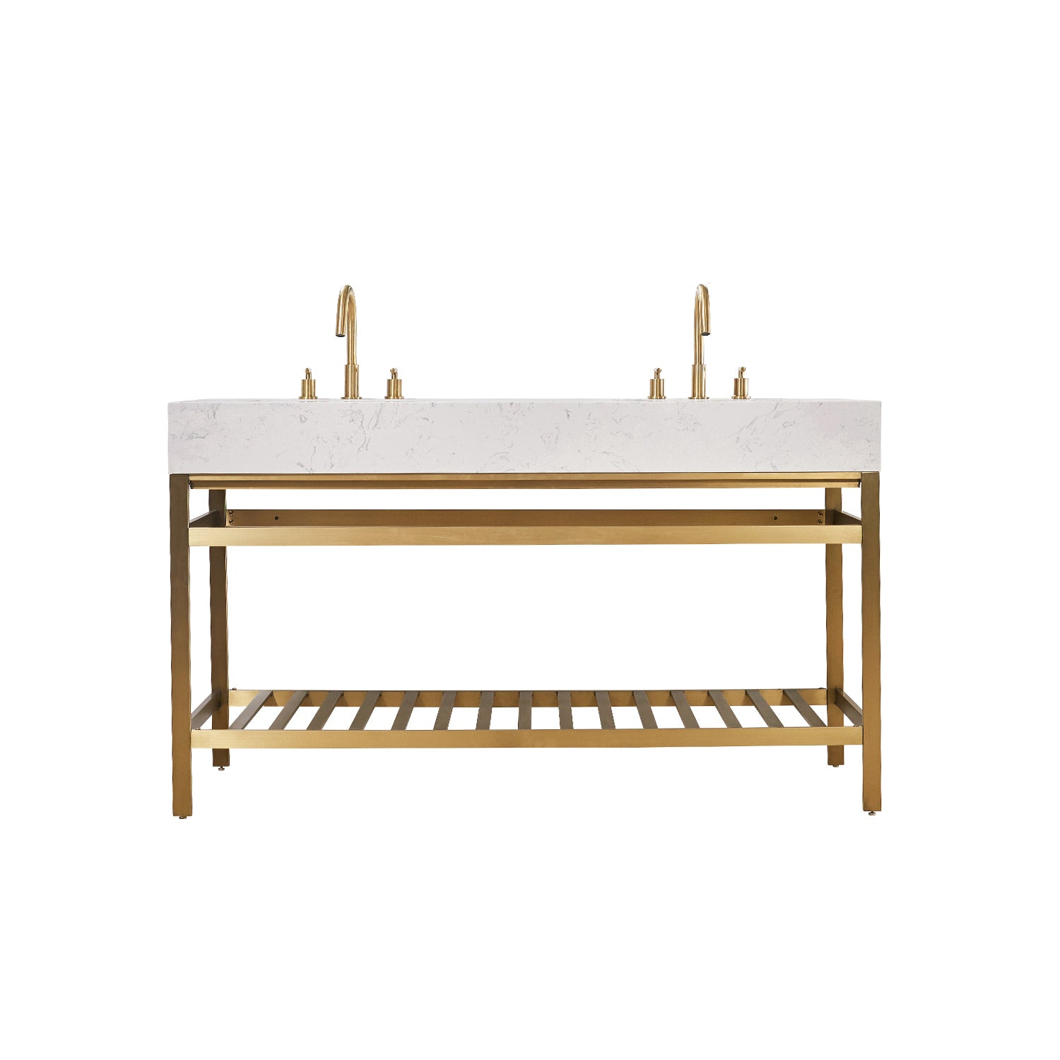 Looking for an elegant addition to your contemporary décor? Our Merano Stainless Steel Console Vanity blends the simple aesthetic of a pedestal sink with the sturdiness of a wall-mounted model. With flawless clean lines, it features a stylishly thick countertop crafted of premium composite stone with delicate veining. The open shelving below is the perfect place to stash plush towels and toiletries.