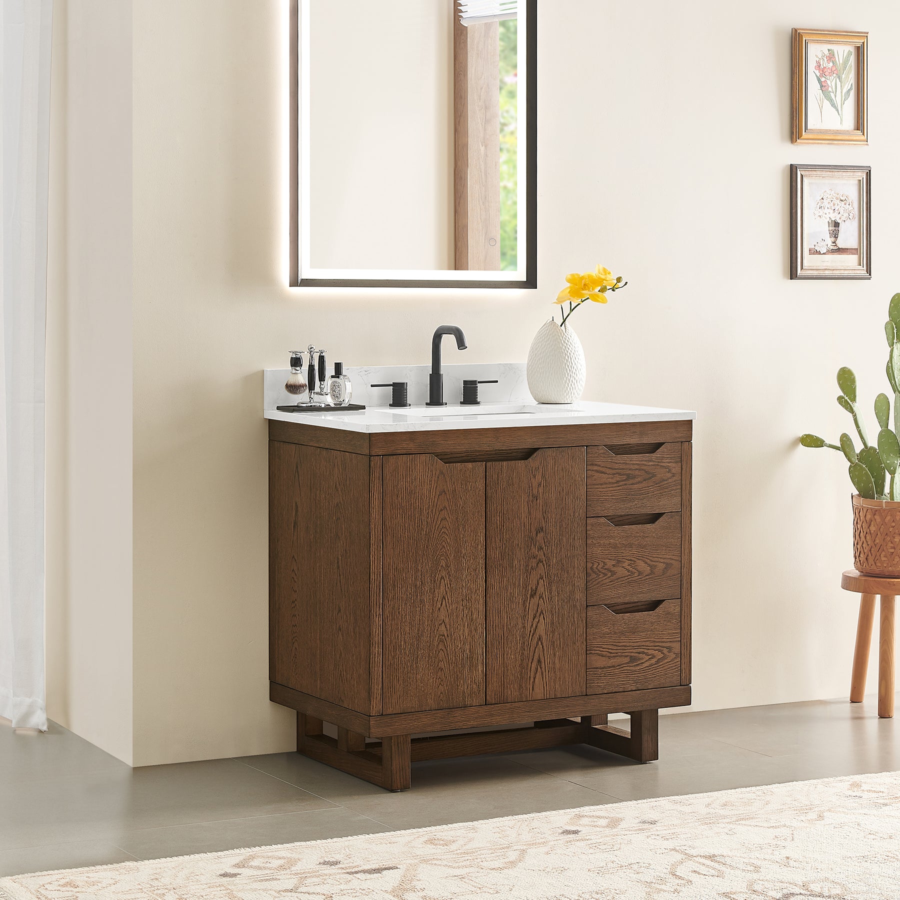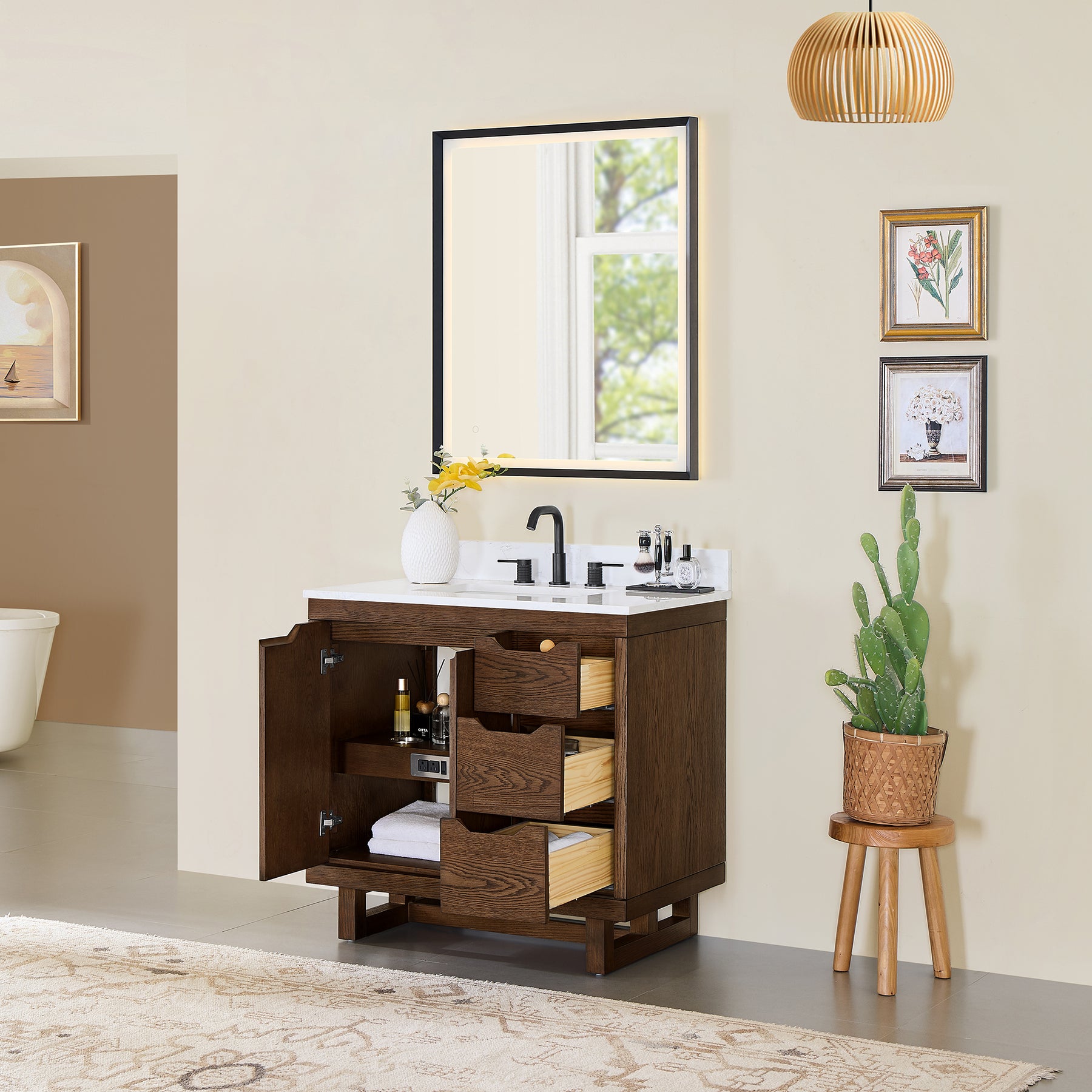 Crafted from rich, poplar wood and plywood, our Mowry bathroom vanity brings warmth and sophistication to your space with its refined, rustic design. Featuring soft-close drawers and doors with integrated finger-pull handles, this vanity is thoughtfully designed for functionality and ease, offering generous storage while maintaining a sleek, uncluttered look. Topped with a crisp white countertop, this vanity perfectly blends modern and earthy elements for a balanced, inviting aesthetic. Built to impress, our vanity offers convenient features like hair dryer stands and removable partitions, along with UL-certified power outlets and USB ports for added safety.