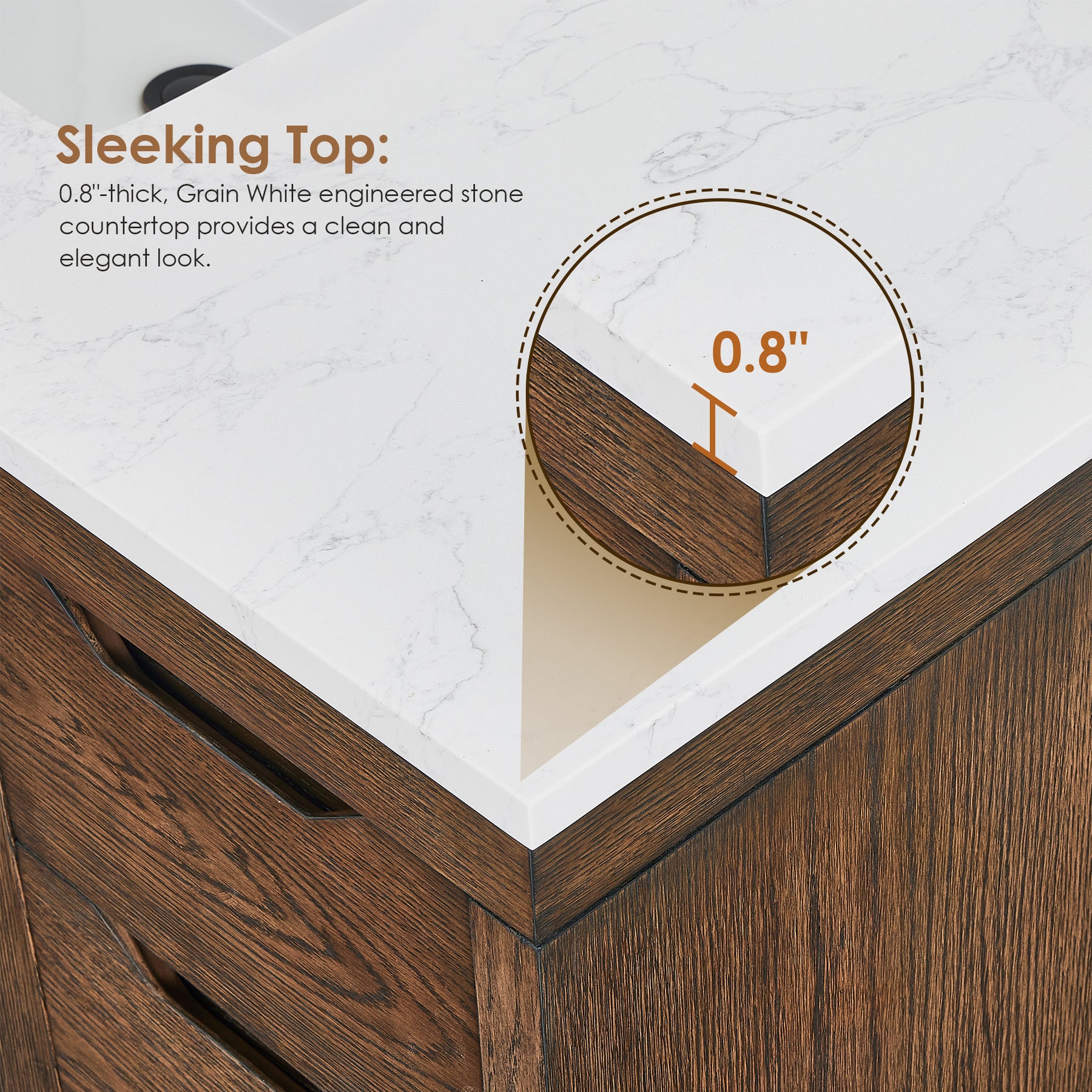 • Hardware: Sleeking Top: 0.8”-thick, Grain White engineered stone countertop provides a clean and elegant look, with an optional 4” backsplash to protect walls from sink splashes.