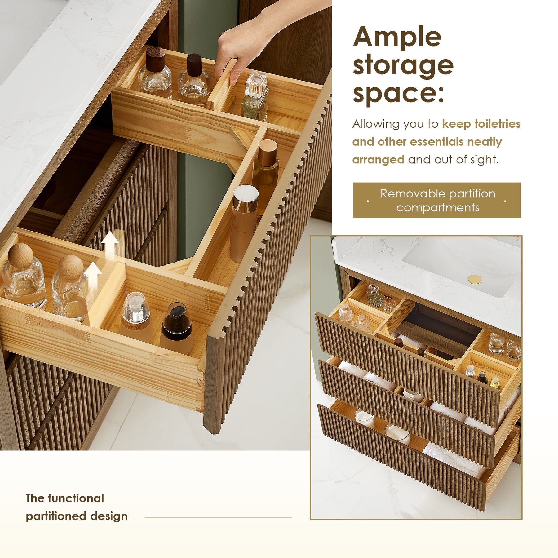 This rustic-inspired vanity features a gorgeous blend of narrow reeding panel and grain white engineered stone that creates a modern and sophisticated aesthetic. A model of understated elegance, it complements a variety of design styles—from traditional and classic to minimalist and contemporary. The innovatively designed, parallel-front drawers feature beveled edges, eliminating the need for conventional handles. Inside, you’ll find wooden U-shaped groove that optimizes space for effortless plumbing installation. Functionally separated drawers offer a well-organized solution for storing toiletries, towels, and other essentials.