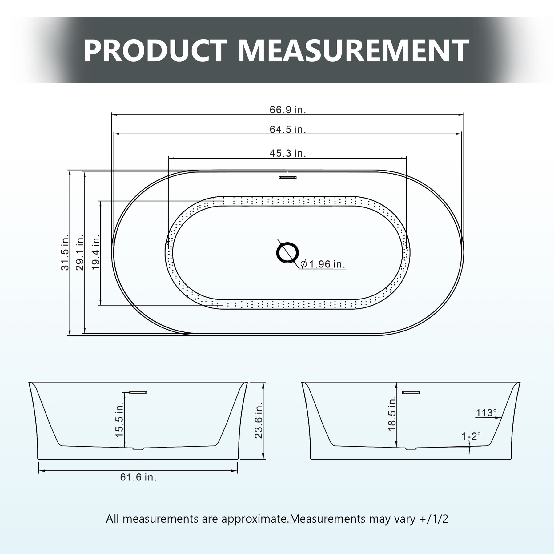 • Bathtub Only Dimensions (HxWxD)(in): H 21.7 x W 66.9 x D 31.5"