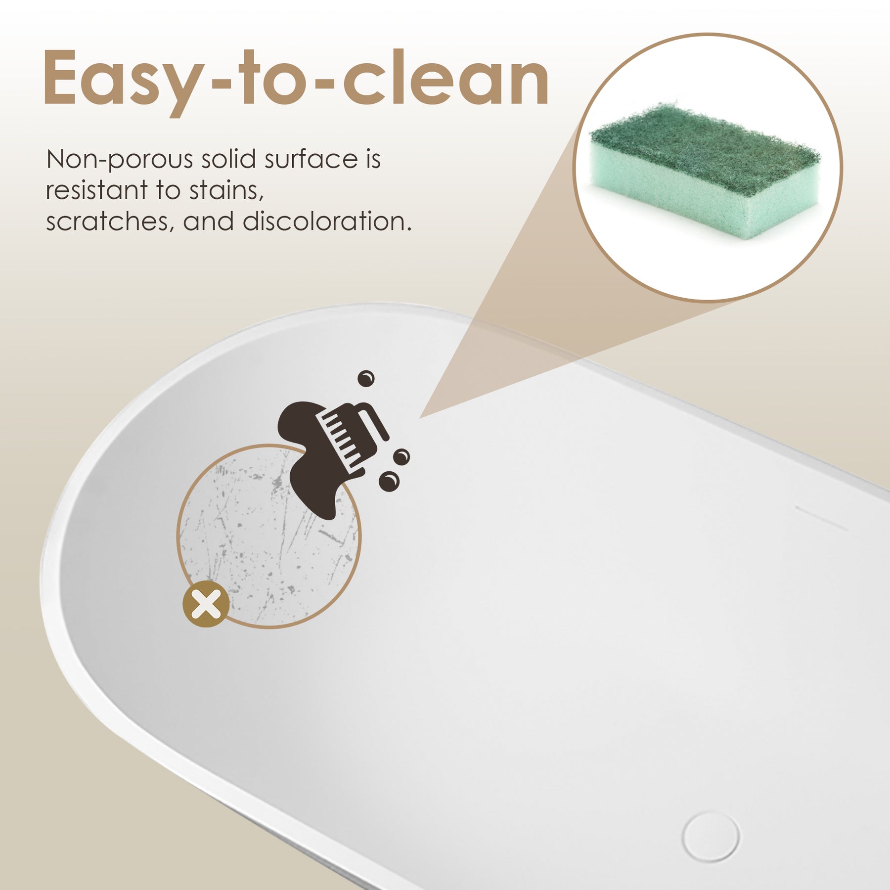 Water Capacity: Easy-to-clean, non-porous solid surface is resistant to stains, scratches, and discoloration.