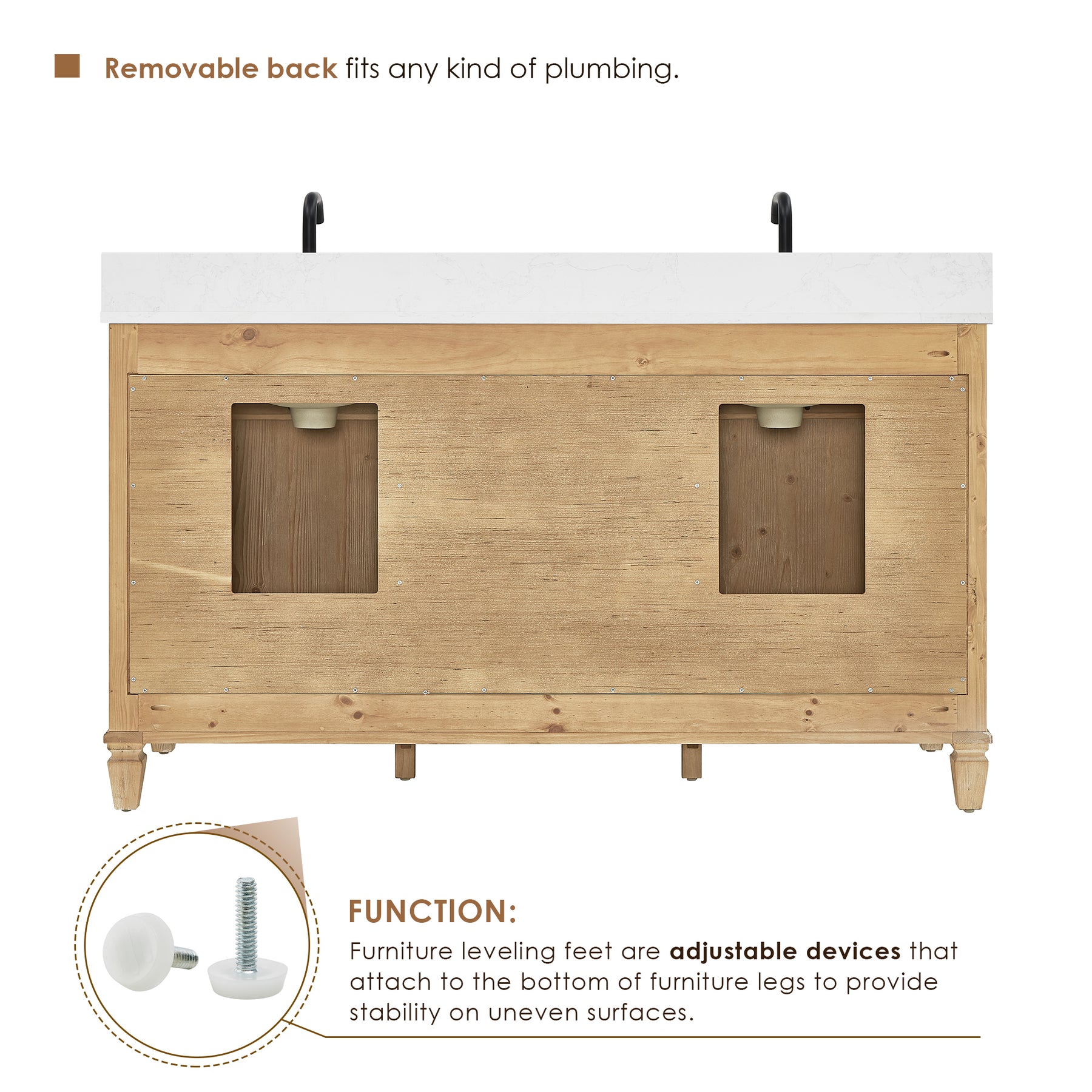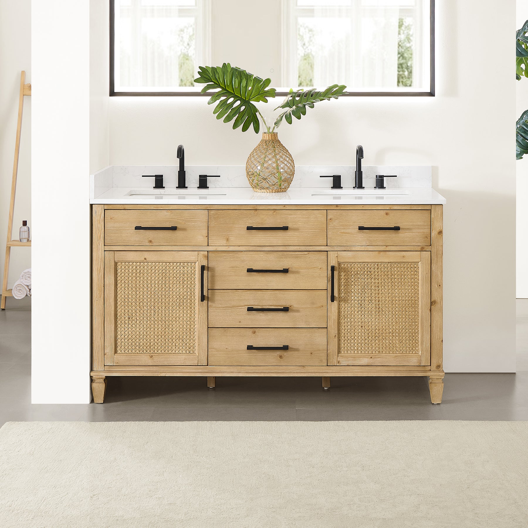 Gorgeous and timeless in design, our Salome vanity is engineered from sturdy materials to withstand years of wear and tear. Its delicate weathered fir finish, accented by rattan-woven detailing and angular vanity legs, offers a natural and elegant visual appeal—perfect for enhancing your bathroom decor. Featuring ample storage space and a matching backsplash and sidesplash, this durable statement piece is crafted for your convenience and ease of maintenance.