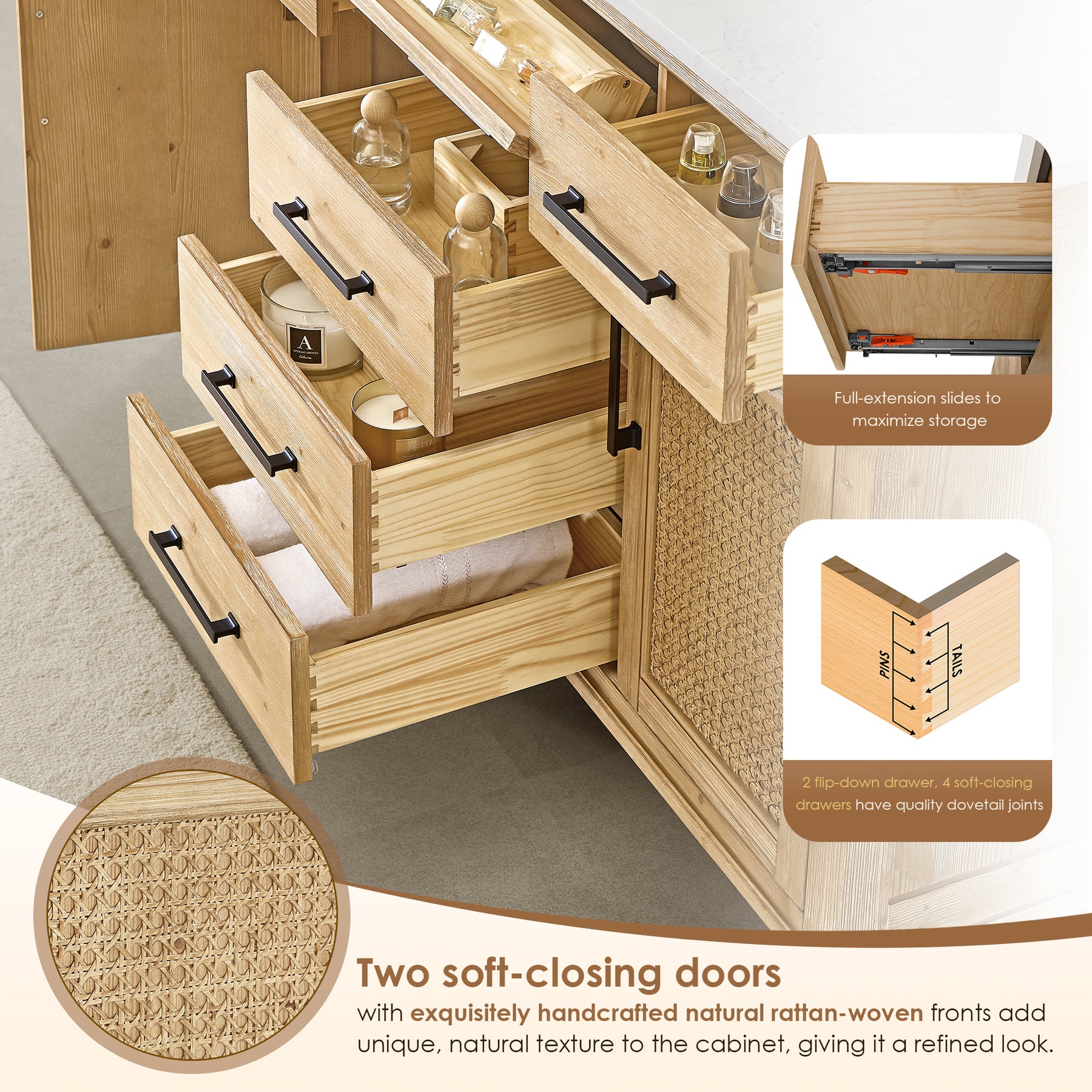 Hardware: Two soft-closing doors with exquisitely handcrafted natural rattan-woven fronts add unique, natural texture to the cabinet, giving it a refined look.