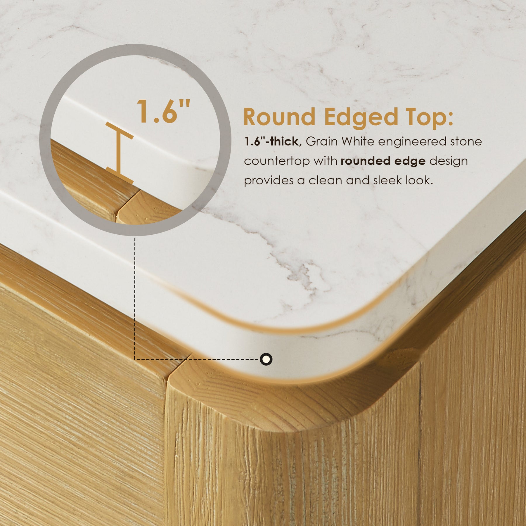 Ceramic Basin: 0.8”-thick, Grain White engineered stone countertop with rounded edge provides a clean and elegant look, with an optional 4” backsplash to protect walls from sink splashes.