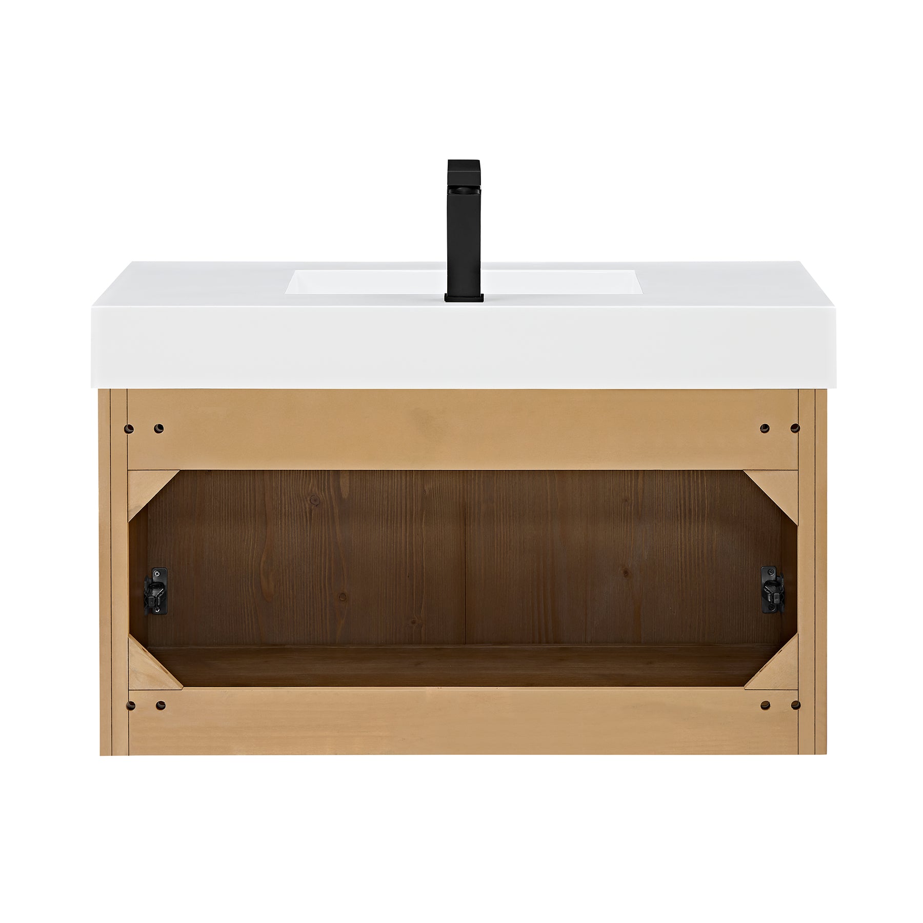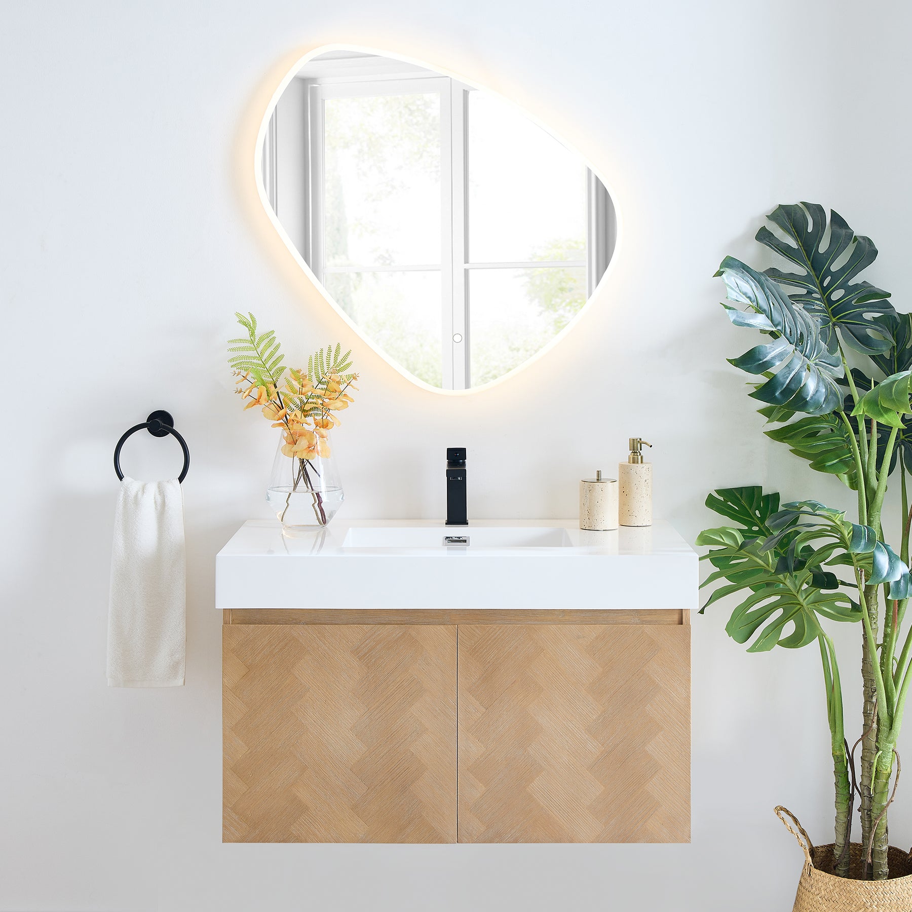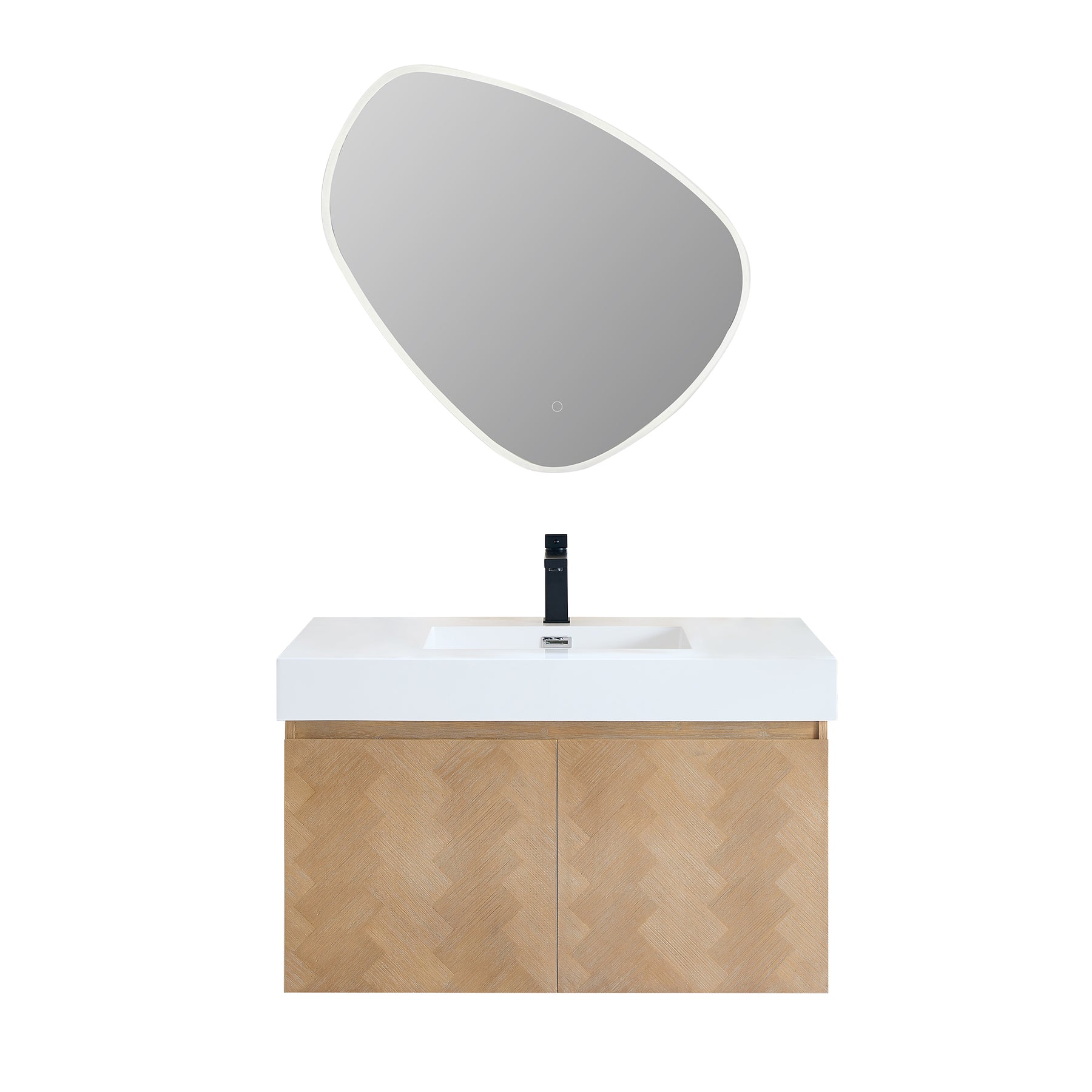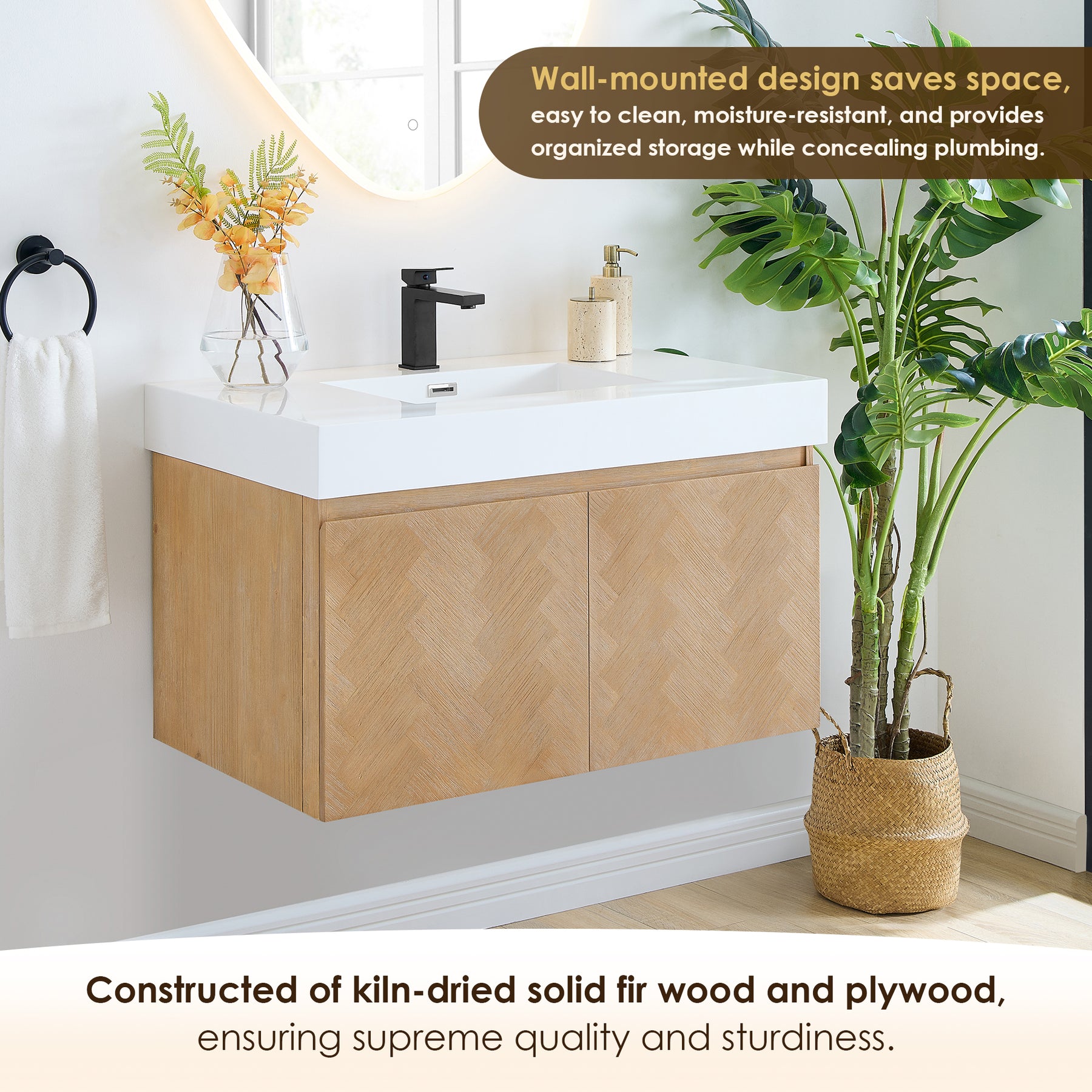 Blending warmth and texture with its light brown finish and elegant chevron pattern, our Siena Vanity transforms your guest or prime bath into a relaxing oasis. Designed for convenience, its 45° inclined-edged door panels and handcrafted jointing allow for a comfortable and smooth operation. Immerse yourself in a luxury experience with our clean wall-mount design and crisp white integrated artificial drop-in sink that is moisture-resistant and easy to maintain.