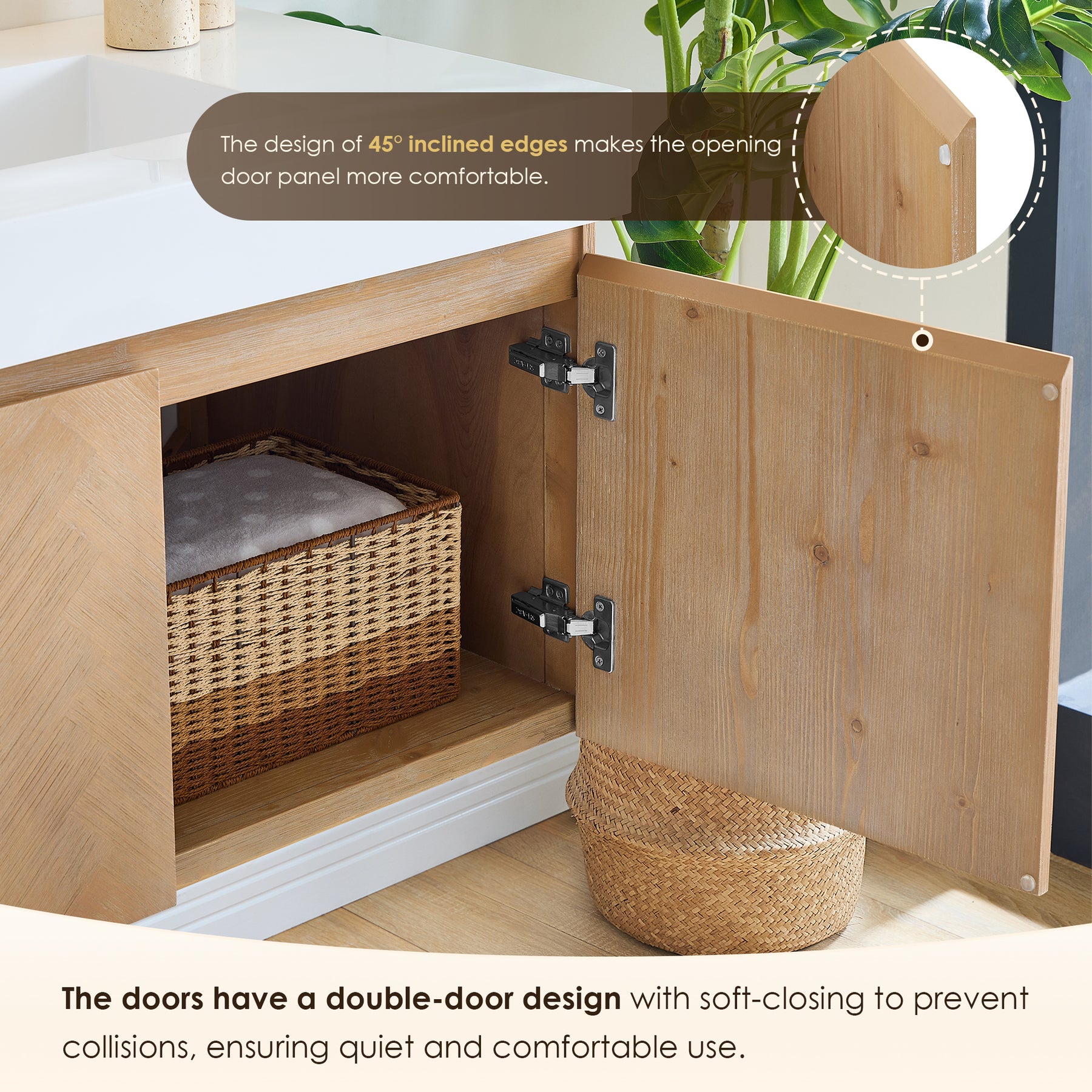 Ceramic Basin: 2 soft-closing doors with finely handcrafted jointing and a chic chevron pattern,while the distressed wood knots lend a natural ambiance.