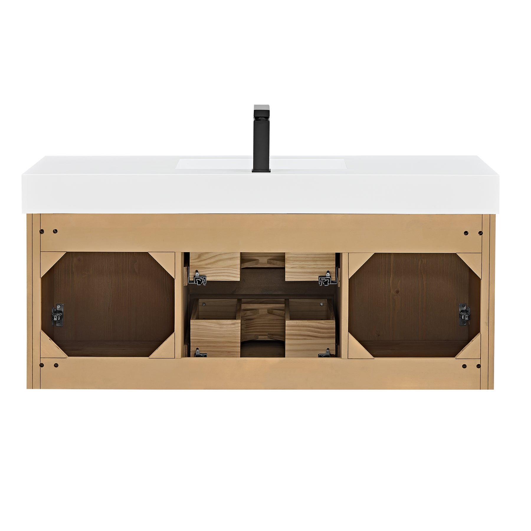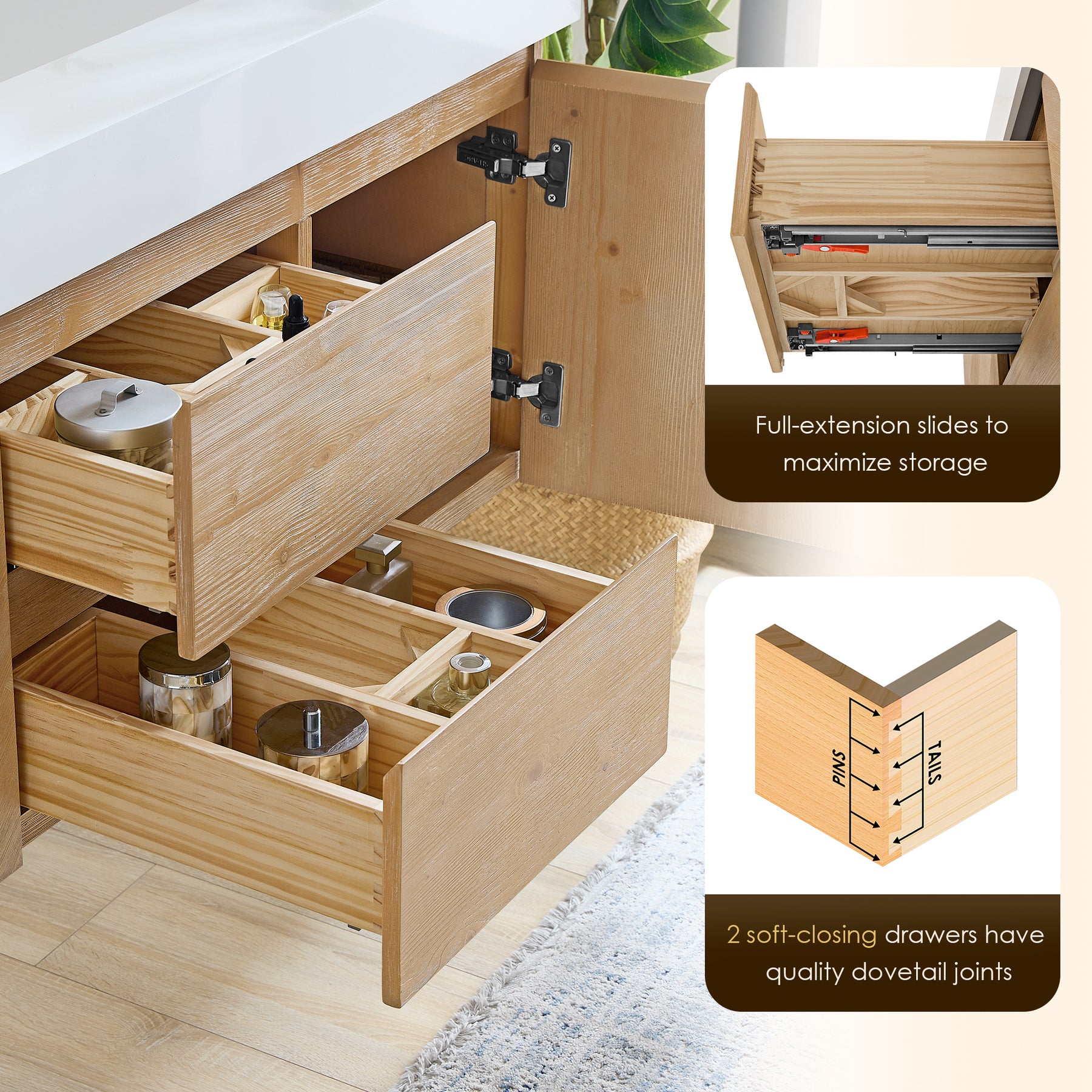 Blending warmth and texture with its light brown finish and elegant chevron pattern, our Siena Vanity transforms your guest or prime bath into a relaxing oasis. Designed for convenience, its 45° inclined-edged door panels and handcrafted jointing allow for a comfortable and smooth operation. Immerse yourself in a luxury experience with our clean wall-mount design and crisp white integrated artificial drop-in sink that is moisture-resistant and easy to maintain.