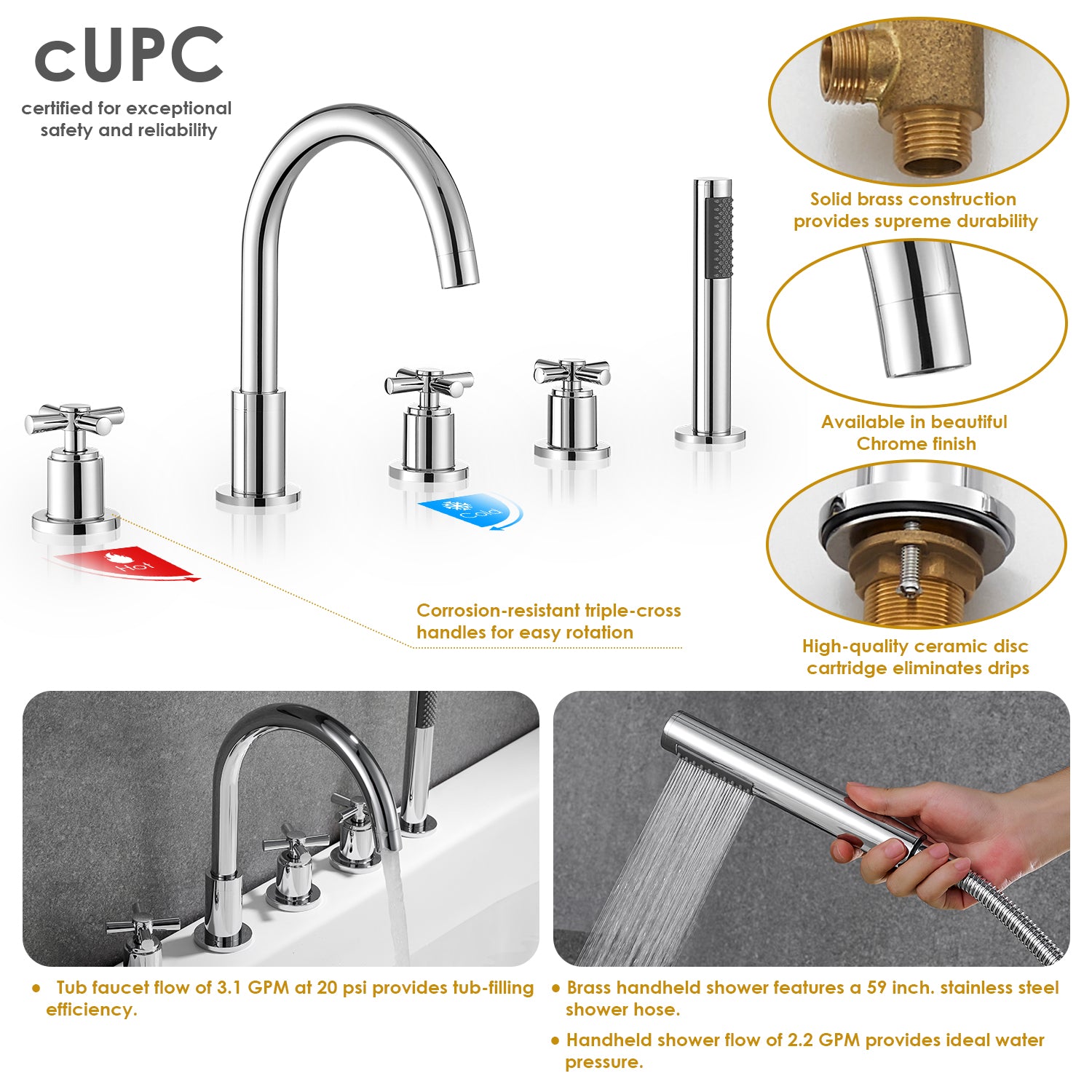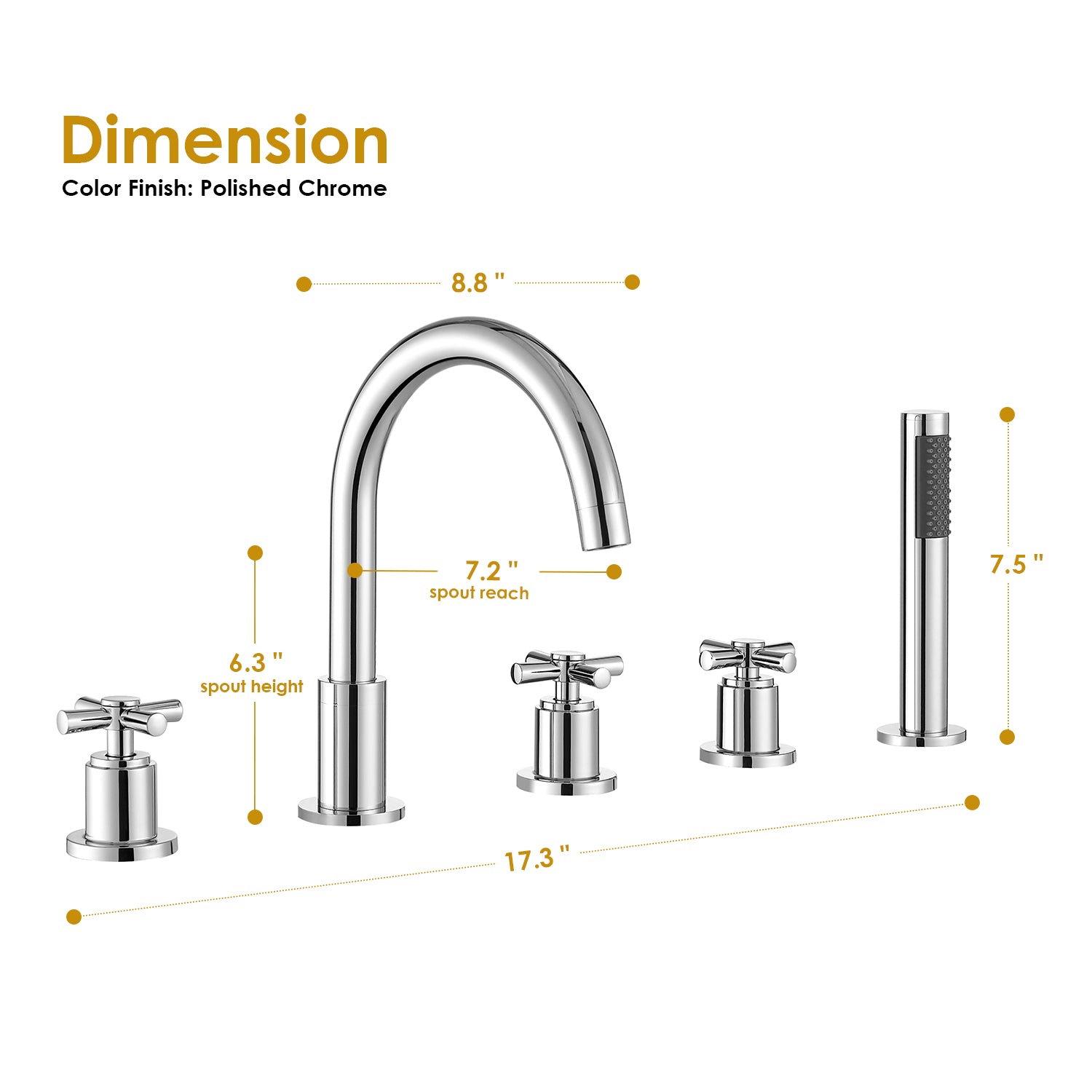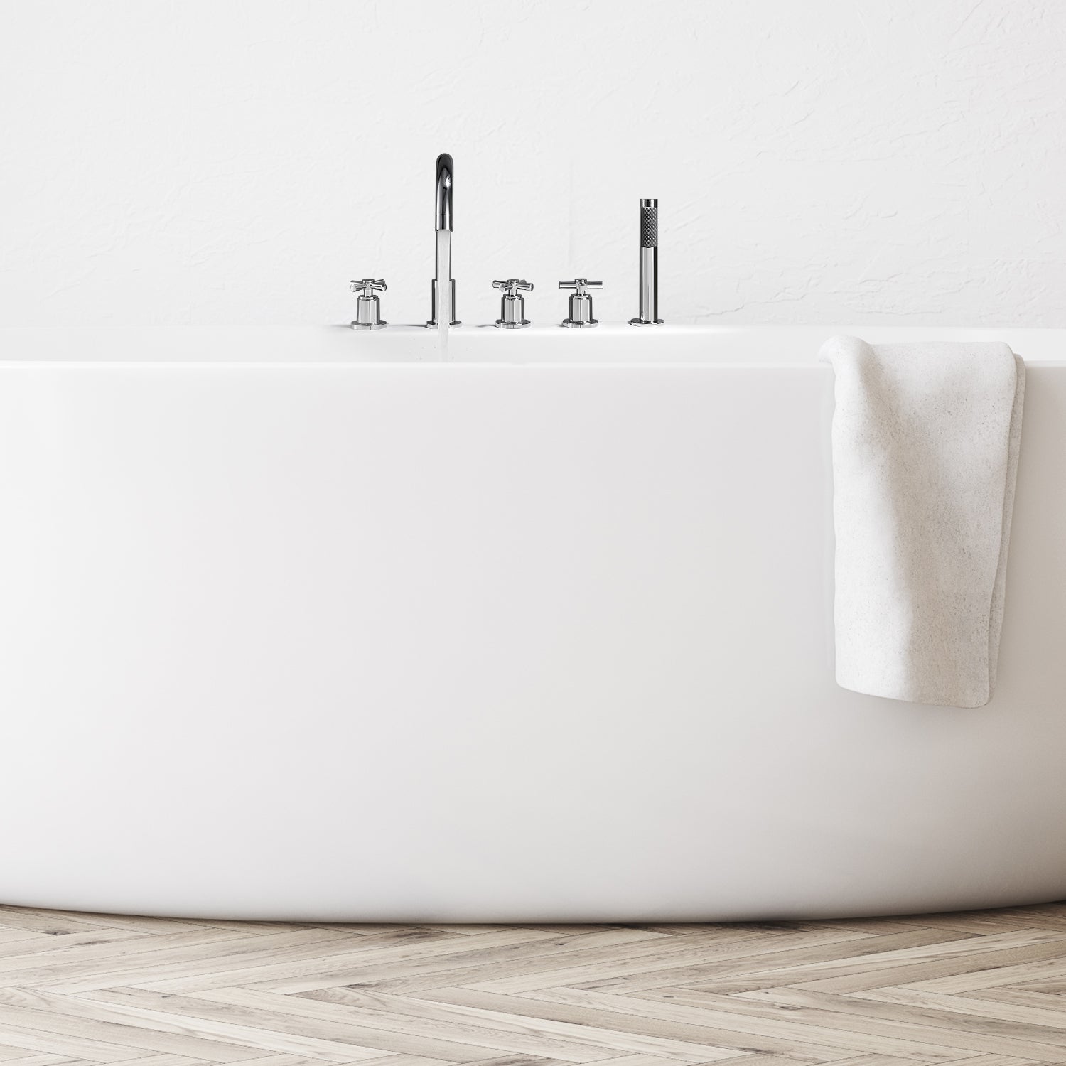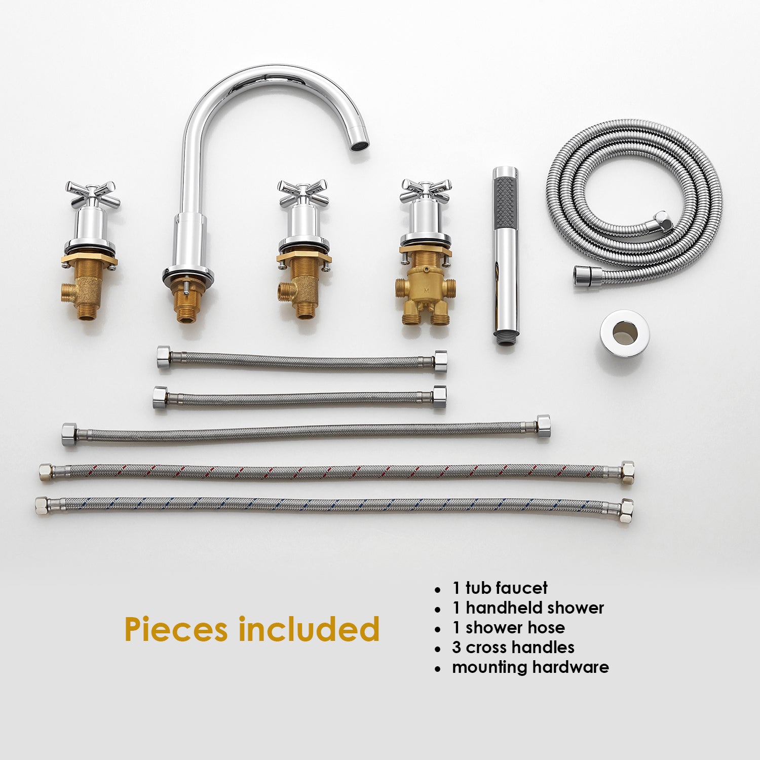 With its refined gooseneck design, our Sorlia Deck-Mount Bathtub Faucet is a stunning and versatile addition to any style tub. It features ergonomic triple-cross handles as well as a handheld shower head that provides the ultimate in bathing convenience. This faucet is constructed of solid brass components and plated in your choice of two elegant finishes. It’s engineered for years of reliable performance and enduring beauty.