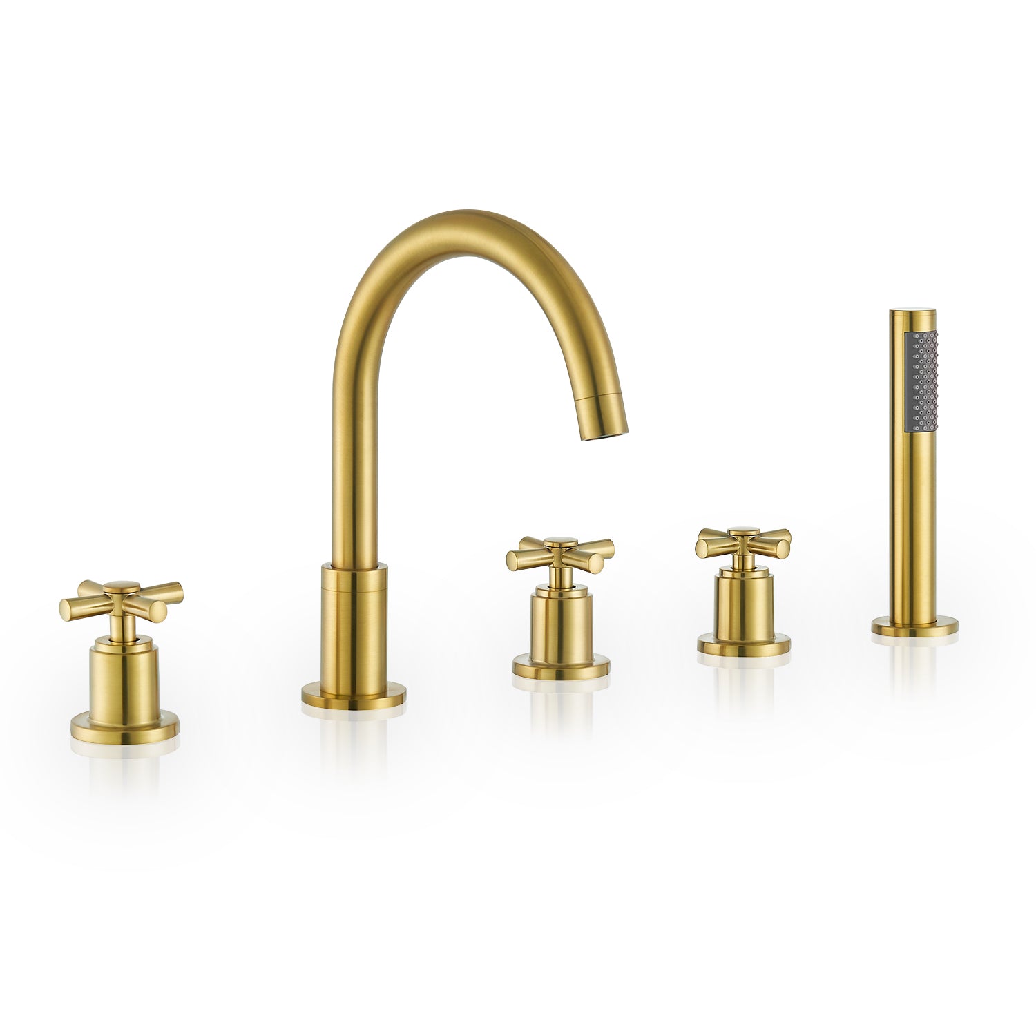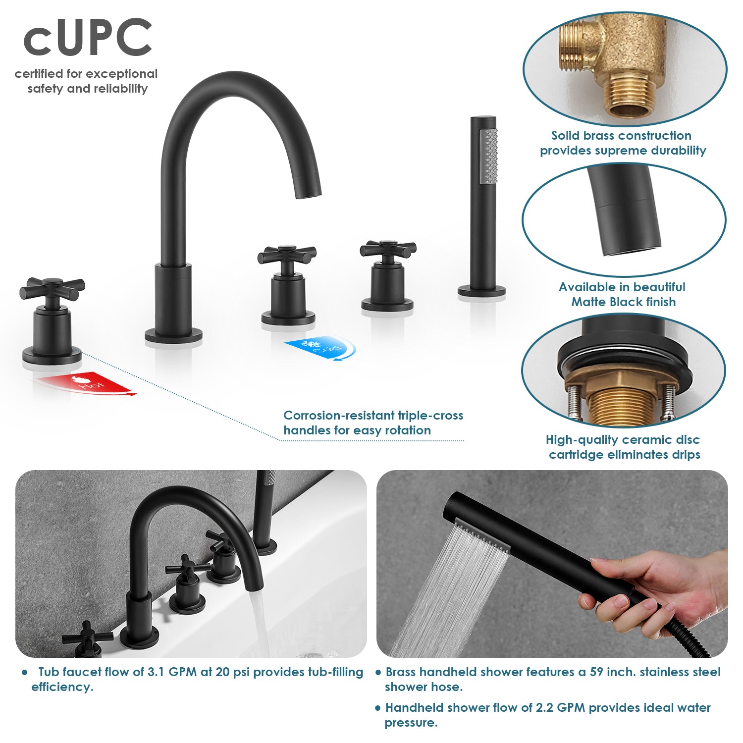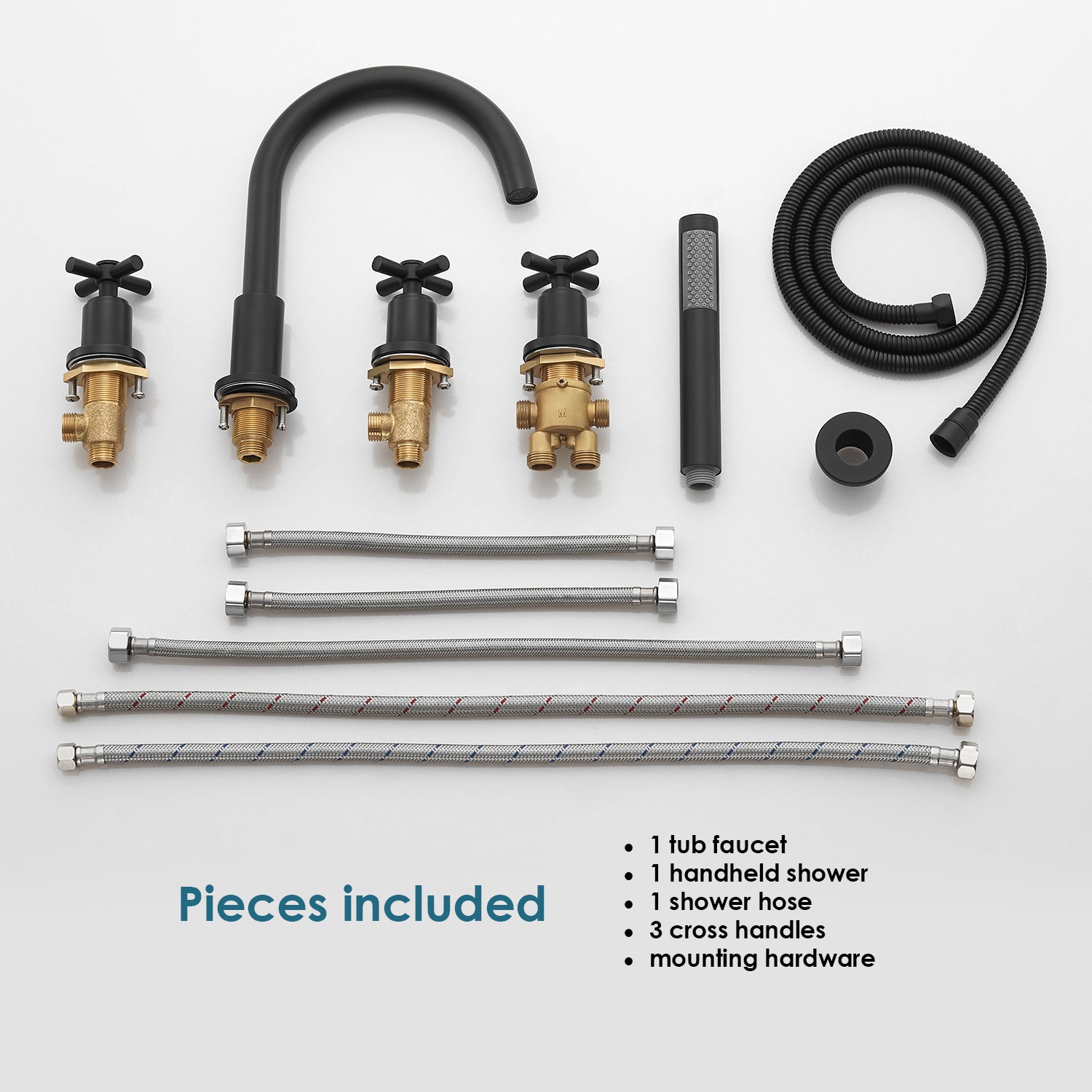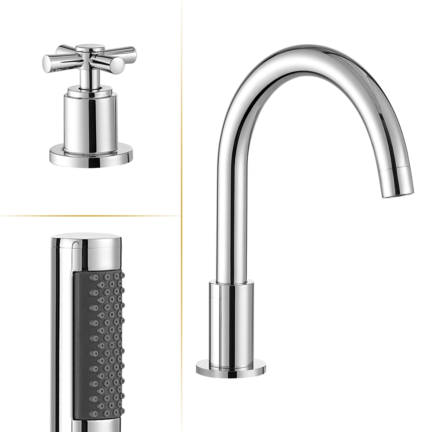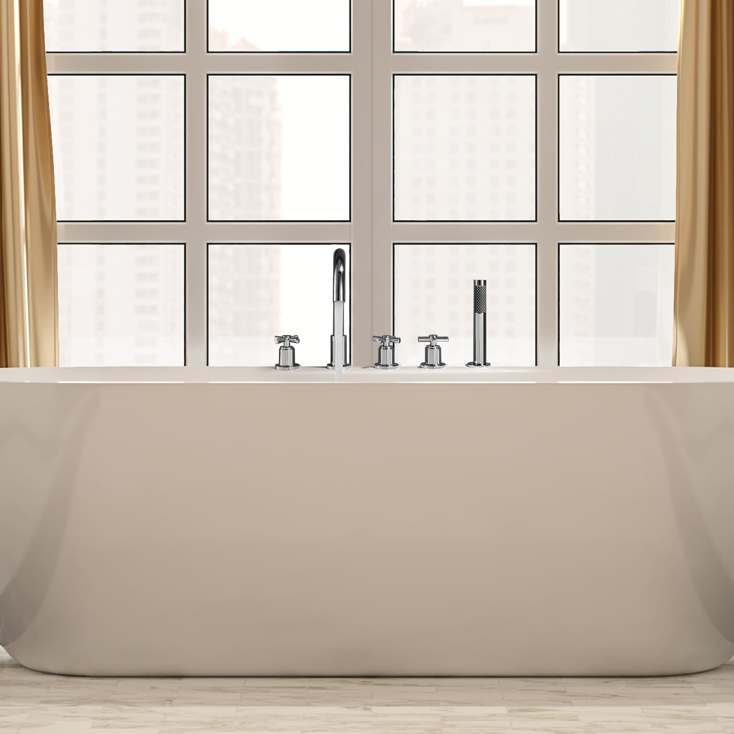 With its refined gooseneck design, our Sorlia Deck-Mount Bathtub Faucet is a stunning and versatile addition to any style tub. It features ergonomic triple-cross handles as well as a handheld shower head that provides the ultimate in bathing convenience. This faucet is constructed of solid brass components and plated in your choice of two elegant finishes. It’s engineered for years of reliable performance and enduring beauty.