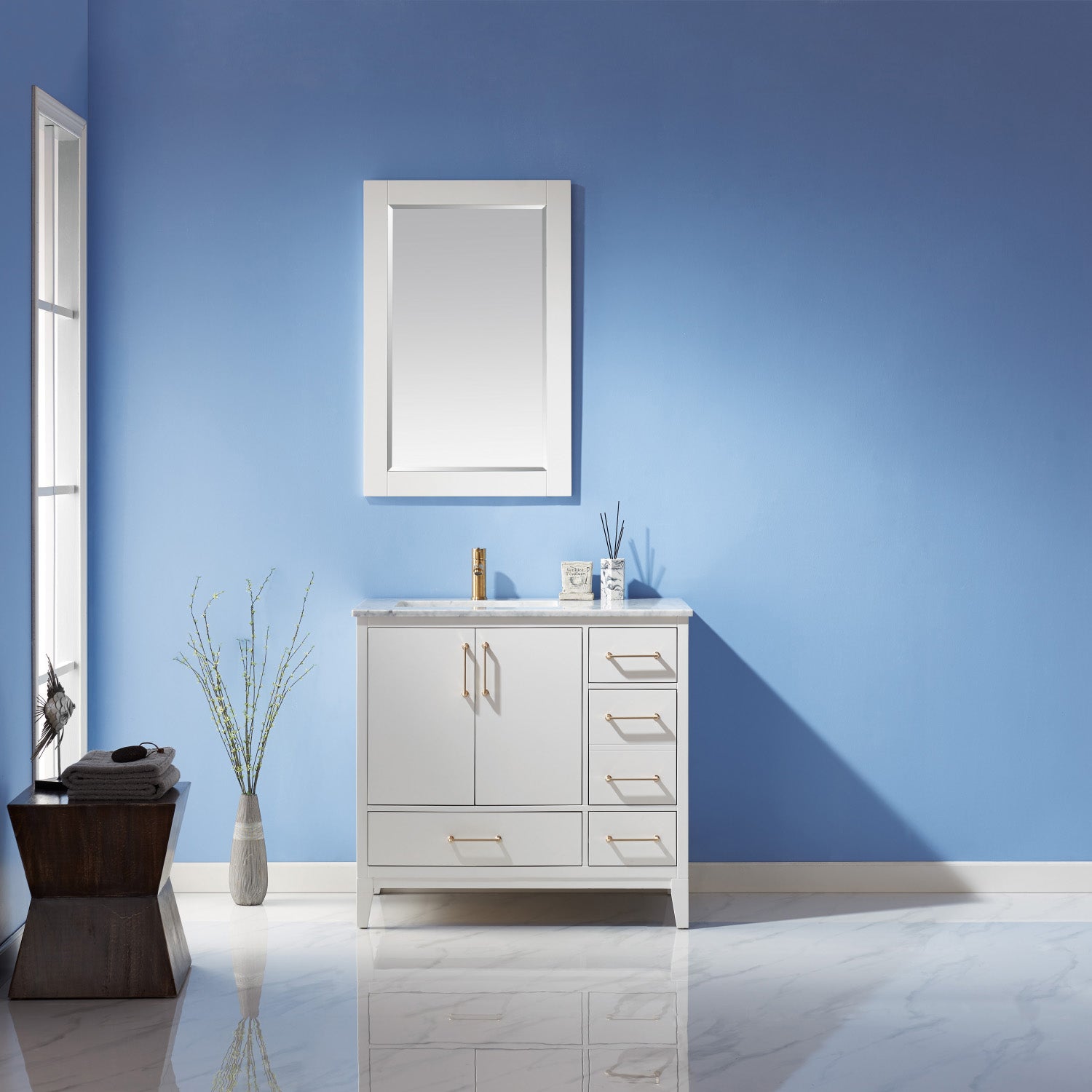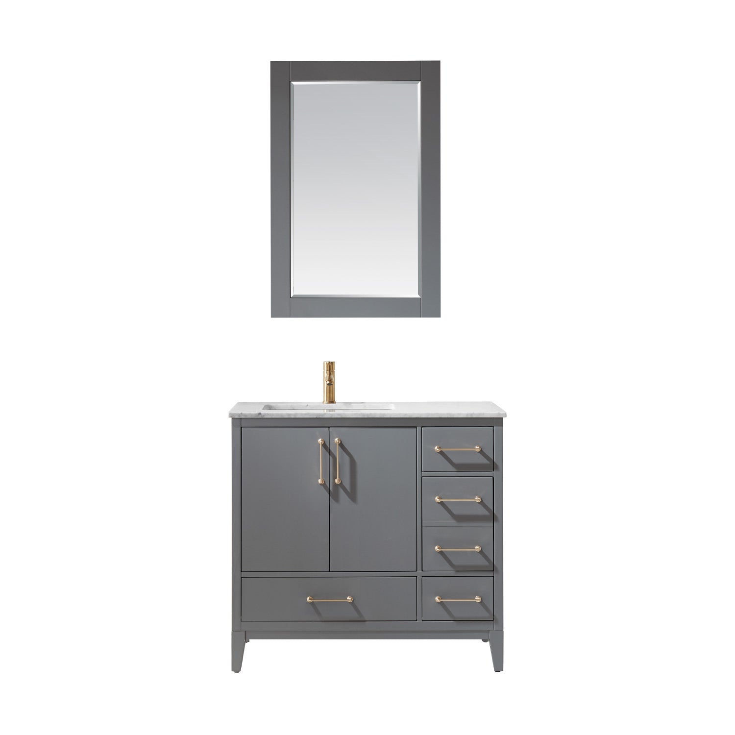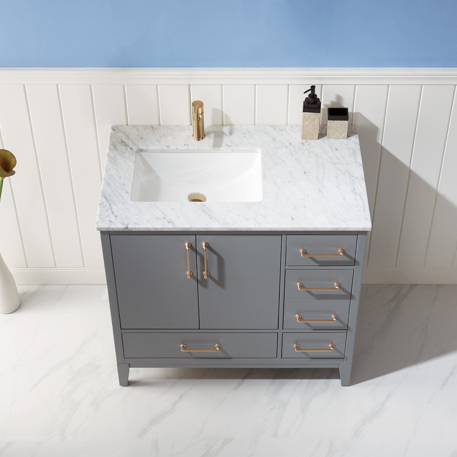 Clean, refined and elegant: that’s the essence of the Sutton Vanity. This beautiful, sturdy furnishing offers an eye-catching medley of finishes, from the gorgeous marble countertop and smooth cabinets to the golden-toned hardware. You’ll love all the storage inside—perfect for housing your favorite towels and other bathroom essentials.