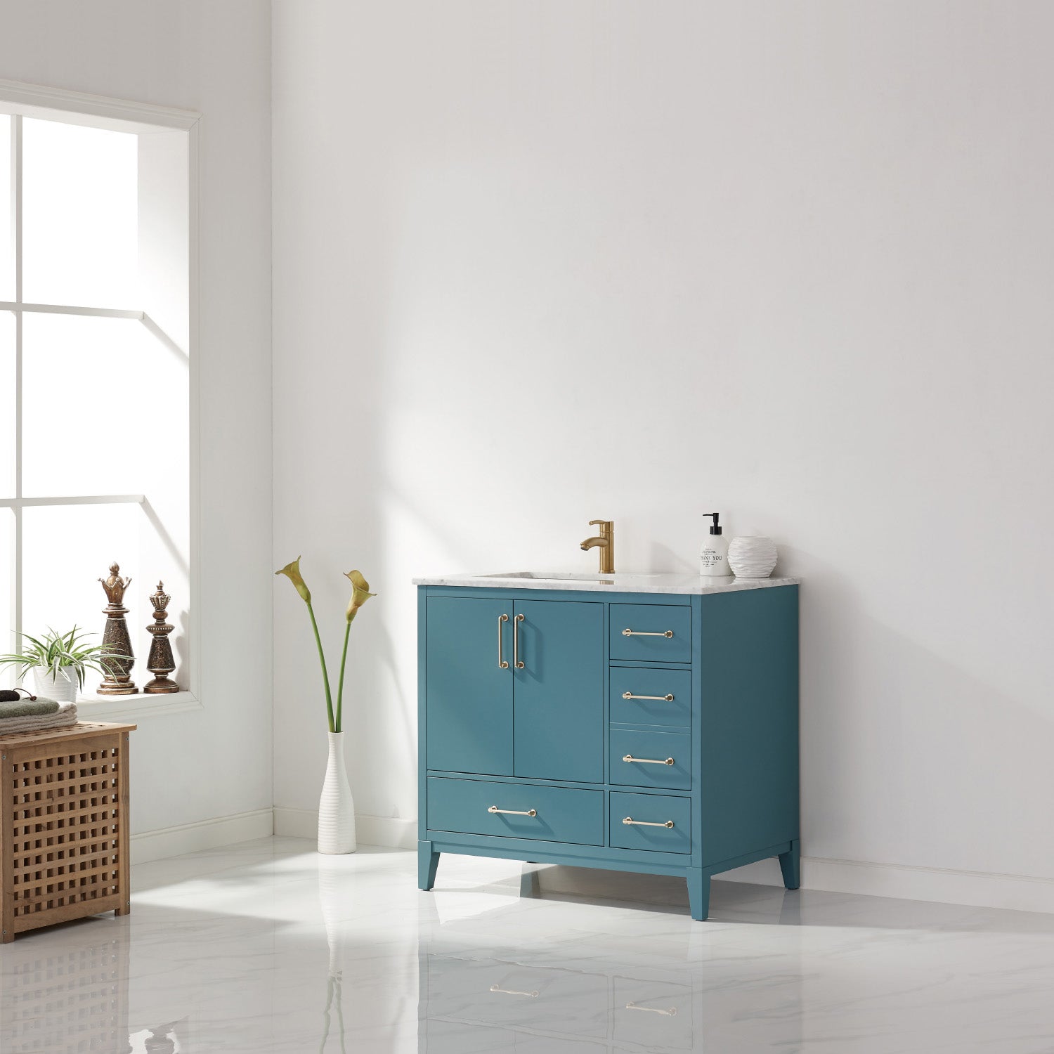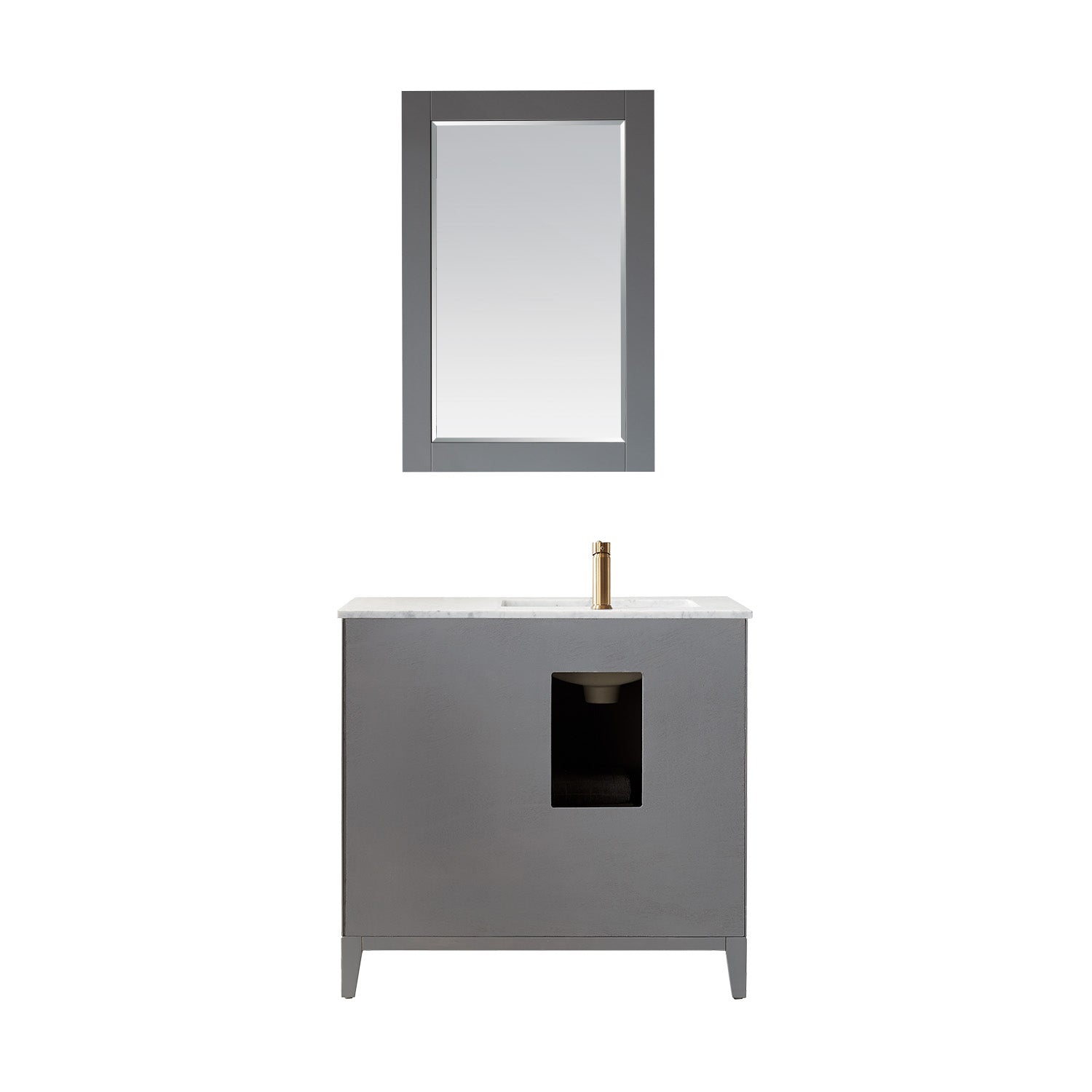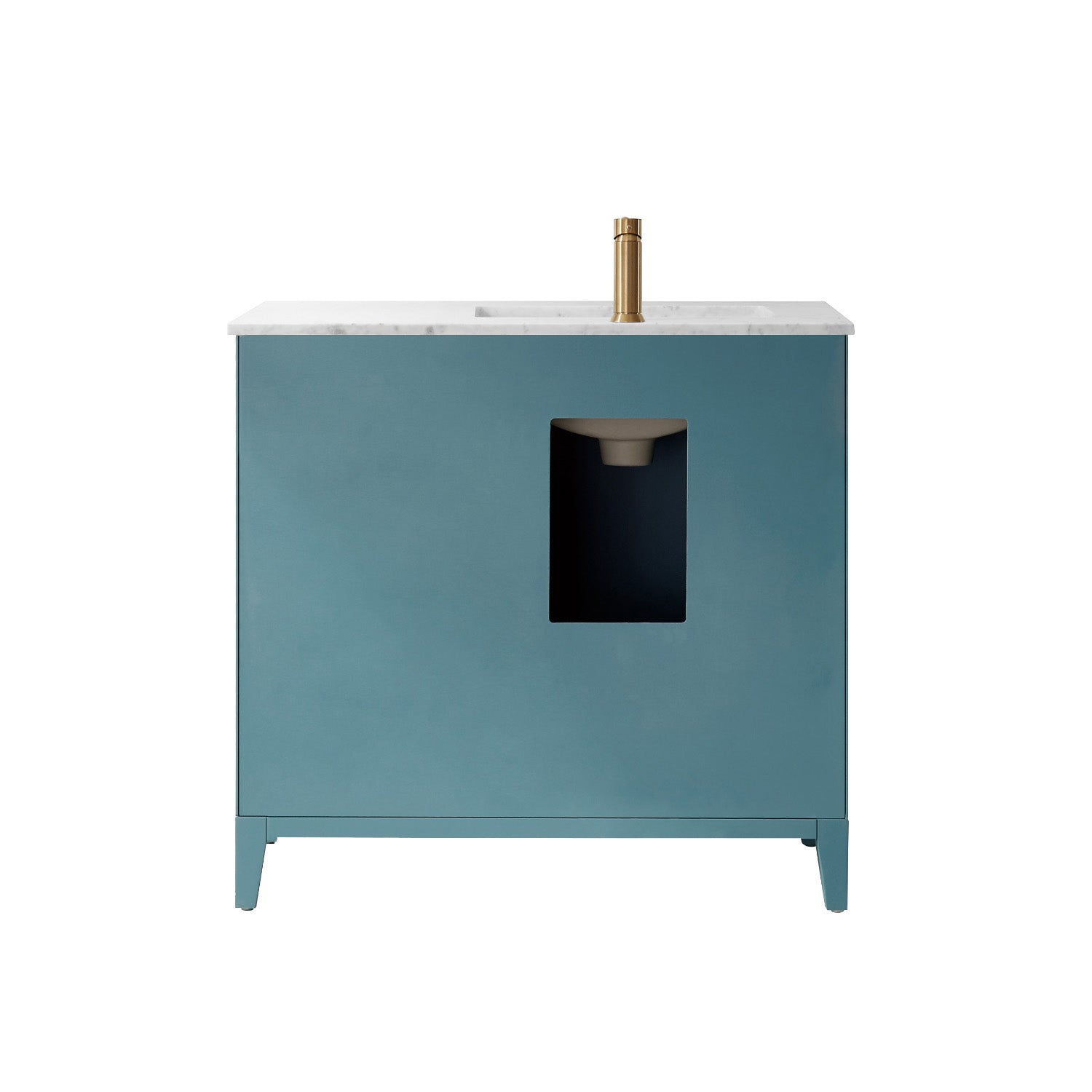 Clean, refined and elegant: that’s the essence of the Sutton Vanity. This beautiful, sturdy furnishing offers an eye-catching medley of finishes, from the gorgeous marble countertop and smooth cabinets to the golden-toned hardware. You’ll love all the storage inside—perfect for housing your favorite towels and other bathroom essentials.