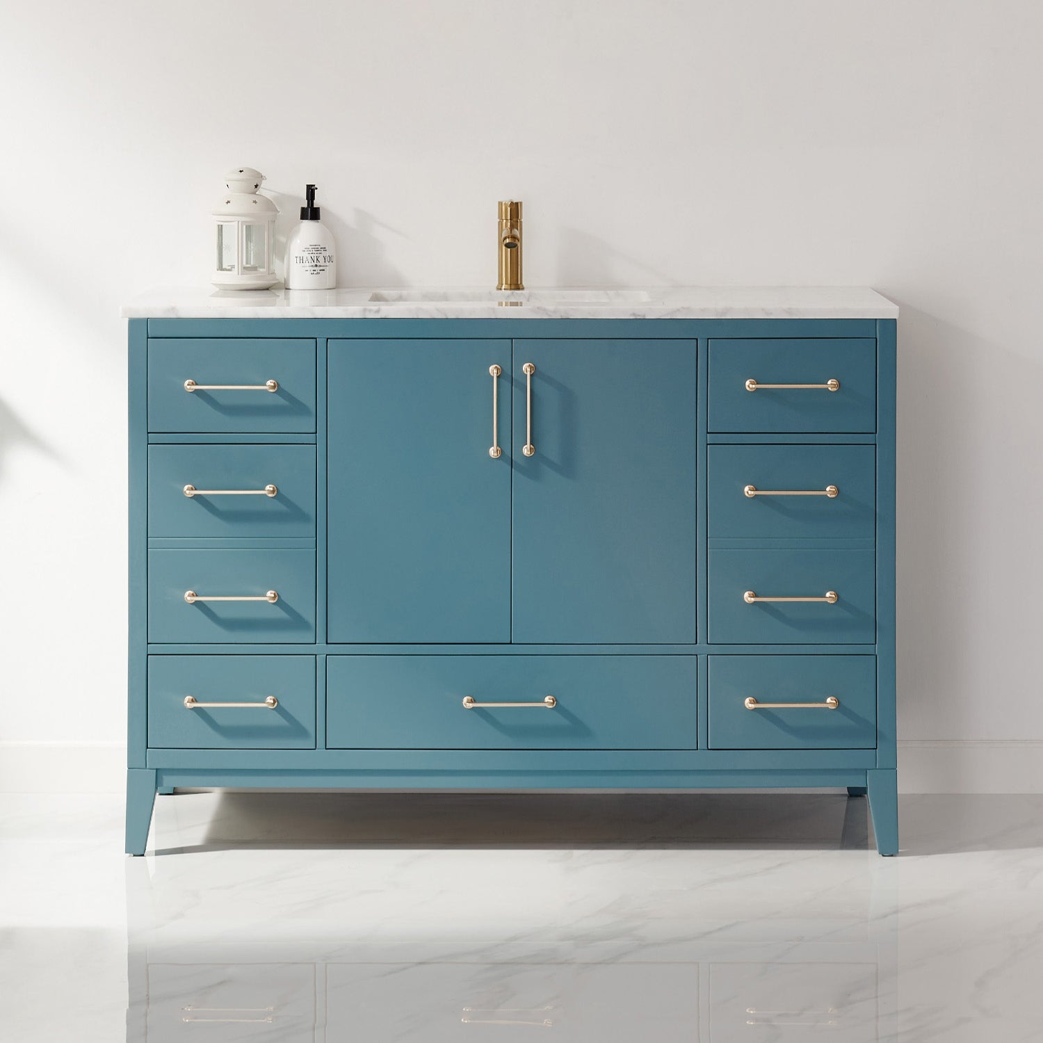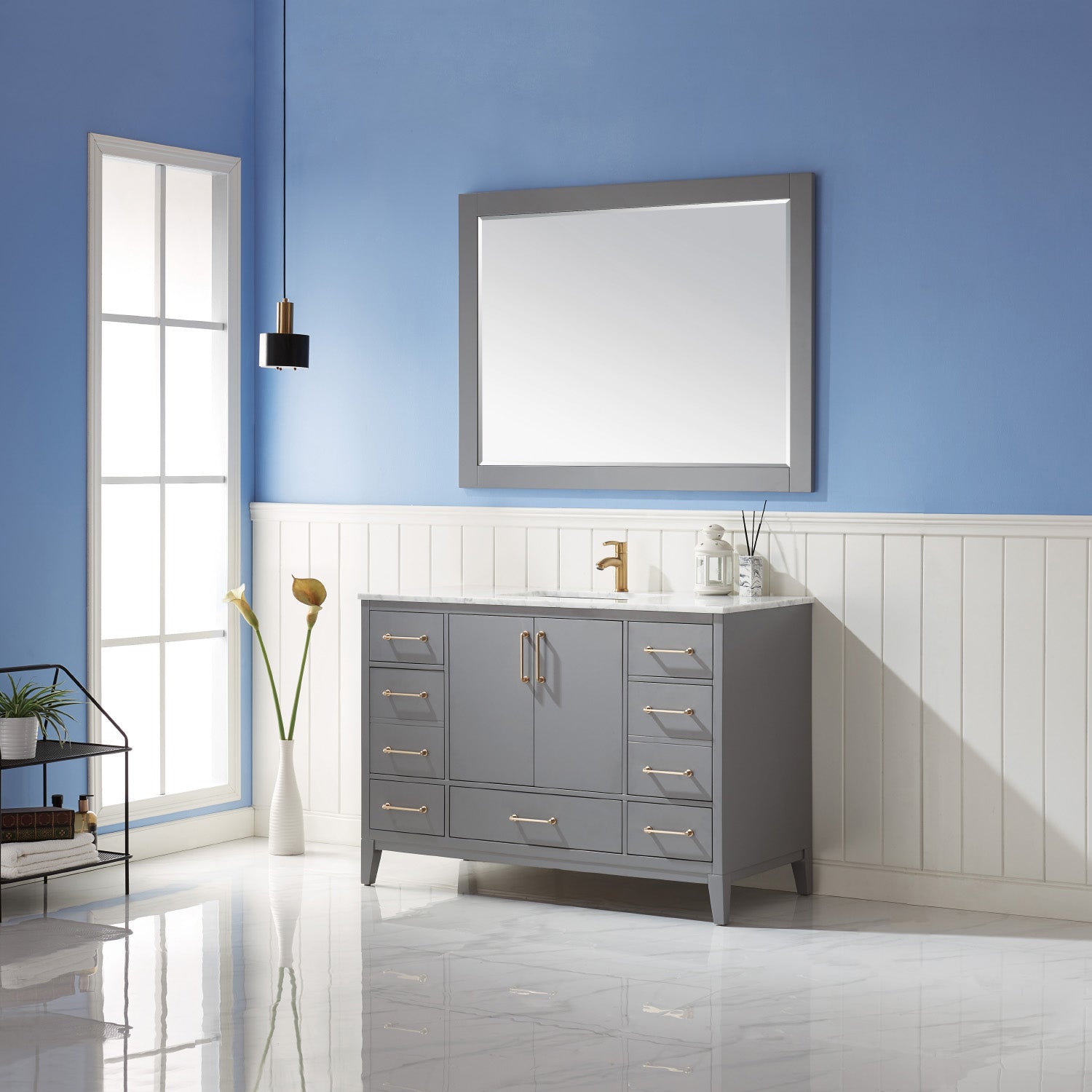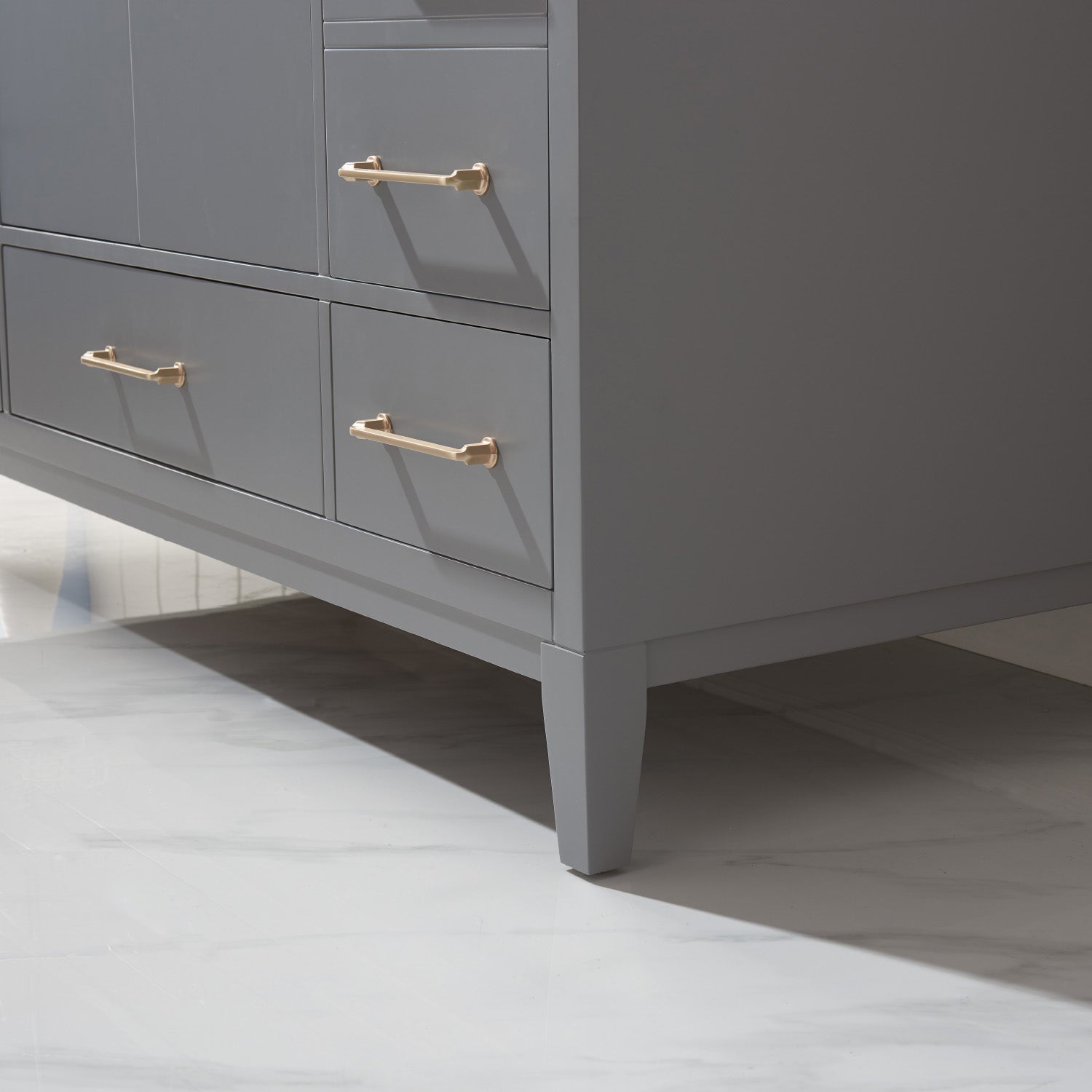 Clean, refined and elegant: that’s the essence of the Sutton Vanity. This beautiful, sturdy furnishing offers an eye-catching medley of finishes, from the gorgeous marble countertop and smooth cabinets to the golden-toned hardware. You’ll love all the storage inside—perfect for housing your favorite towels and other bathroom essentials.