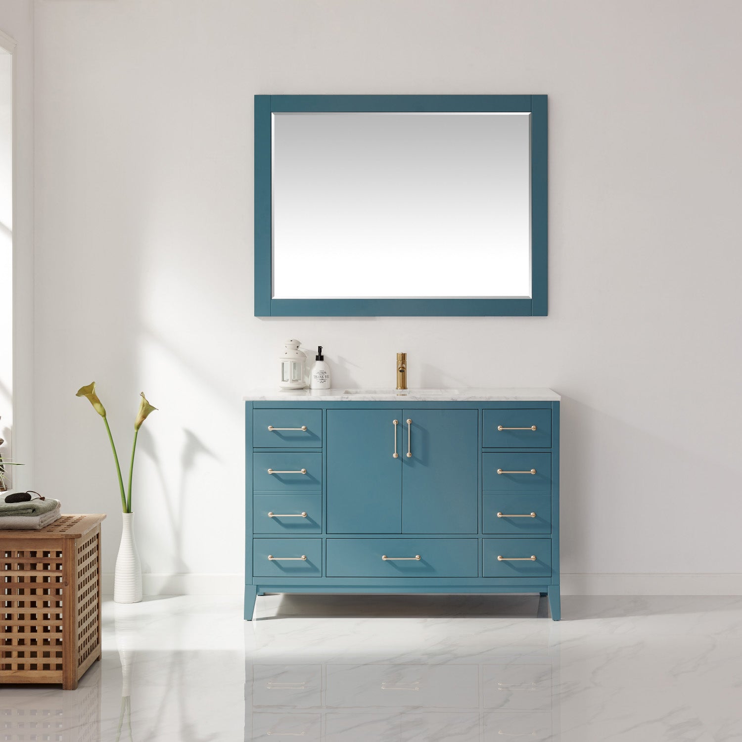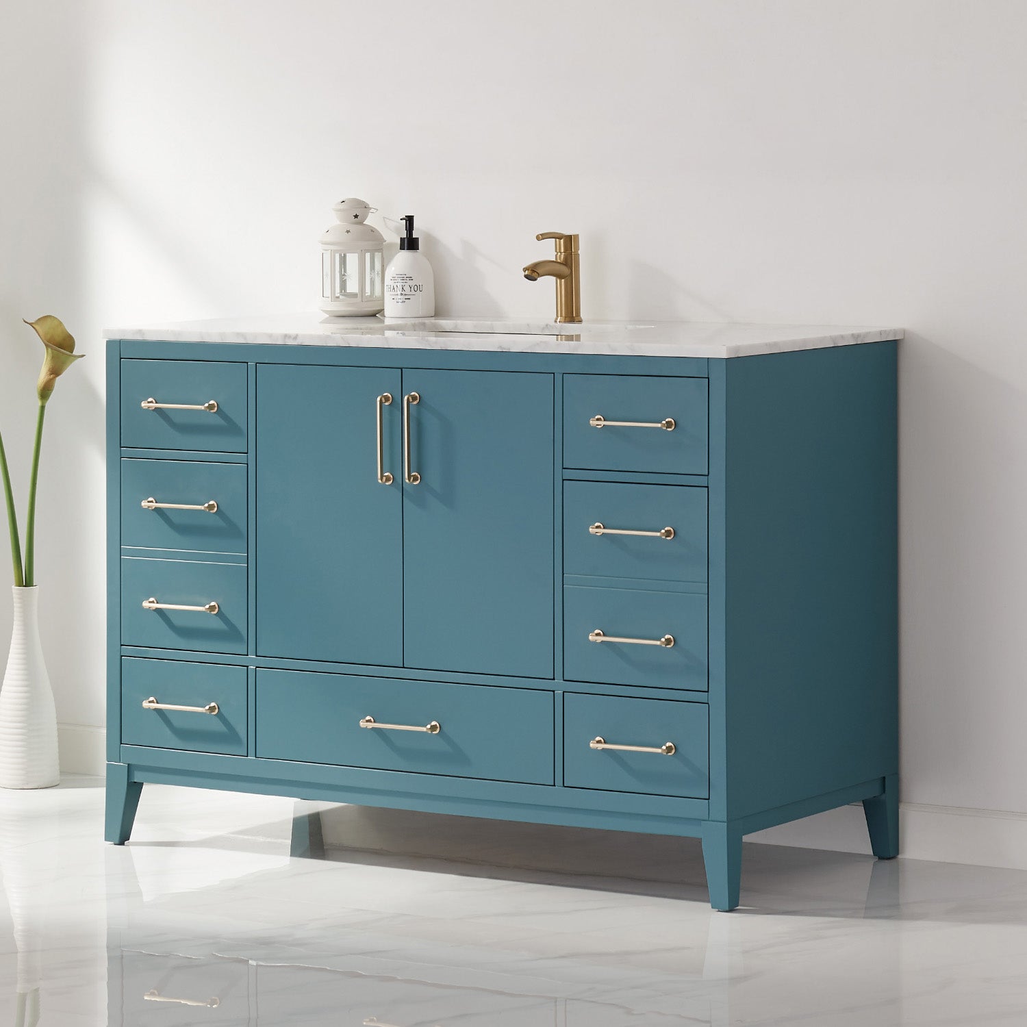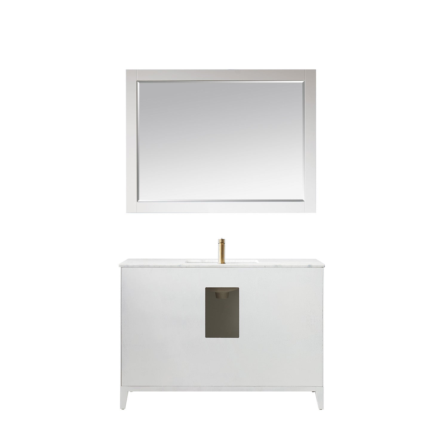 Clean, refined and elegant: that’s the essence of the Sutton Vanity. This beautiful, sturdy furnishing offers an eye-catching medley of finishes, from the gorgeous marble countertop and smooth cabinets to the golden-toned hardware. You’ll love all the storage inside—perfect for housing your favorite towels and other bathroom essentials.