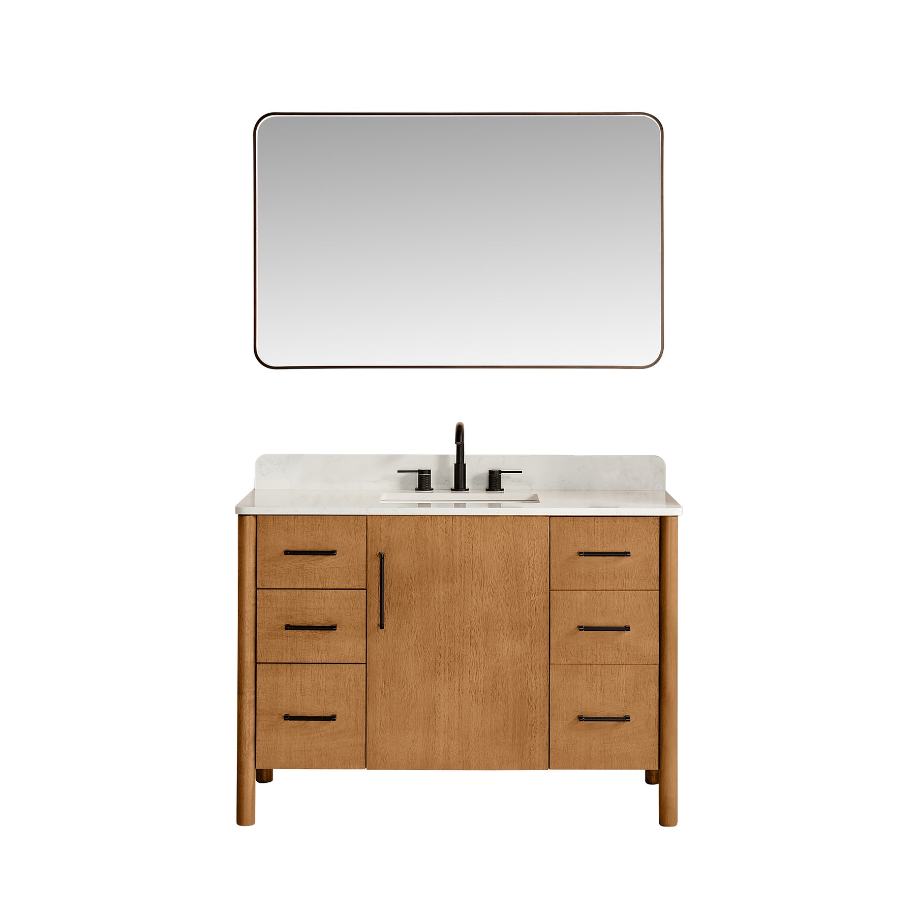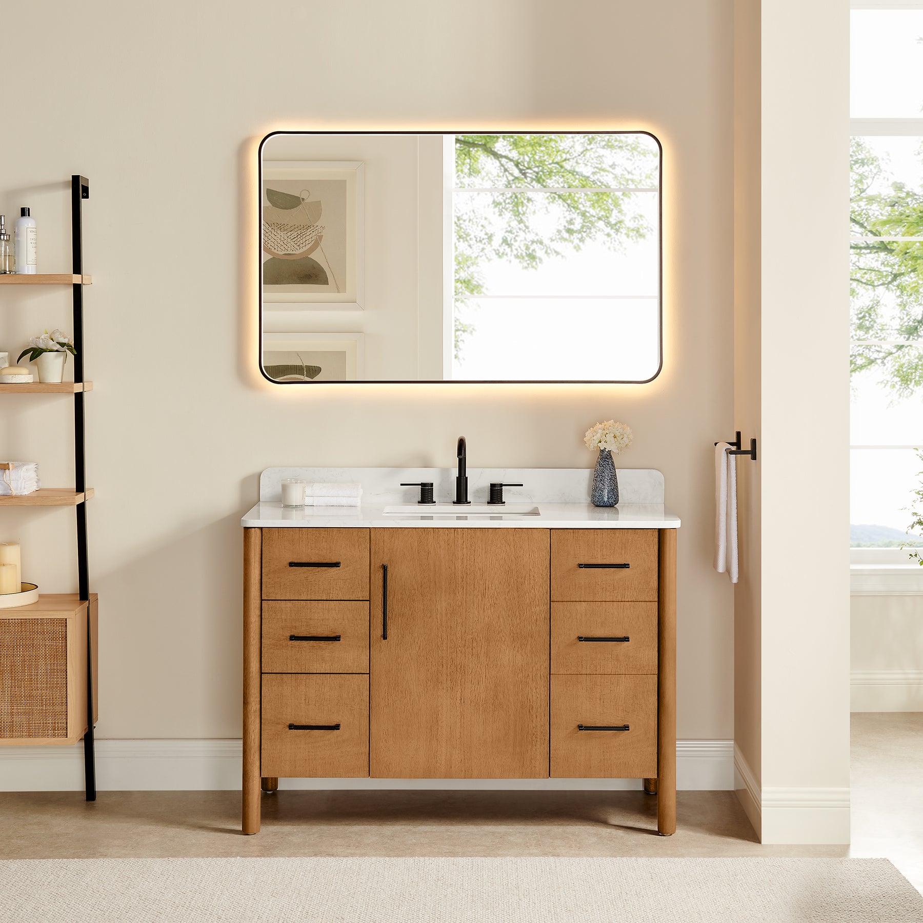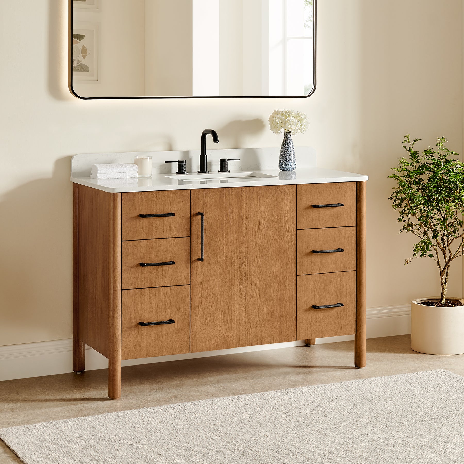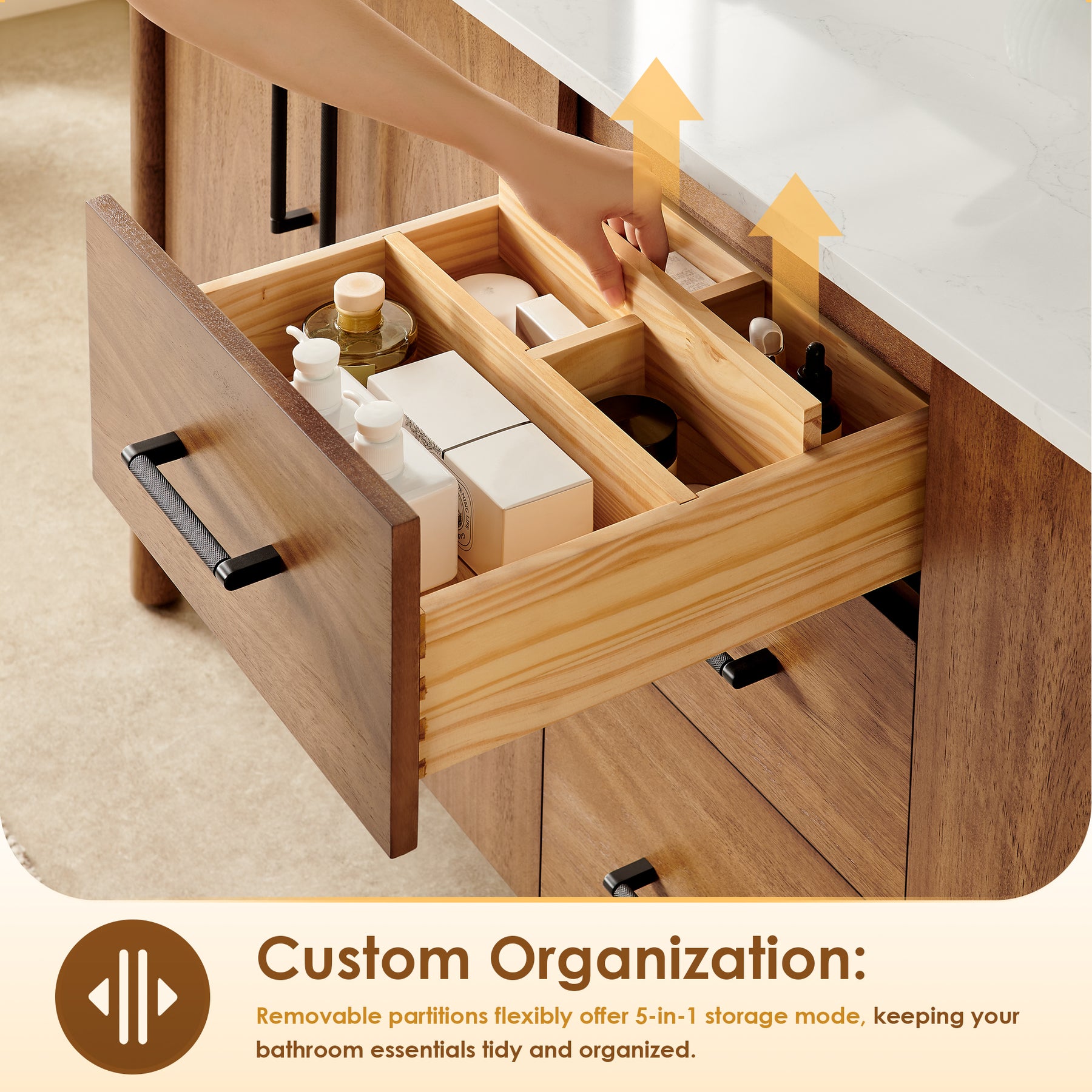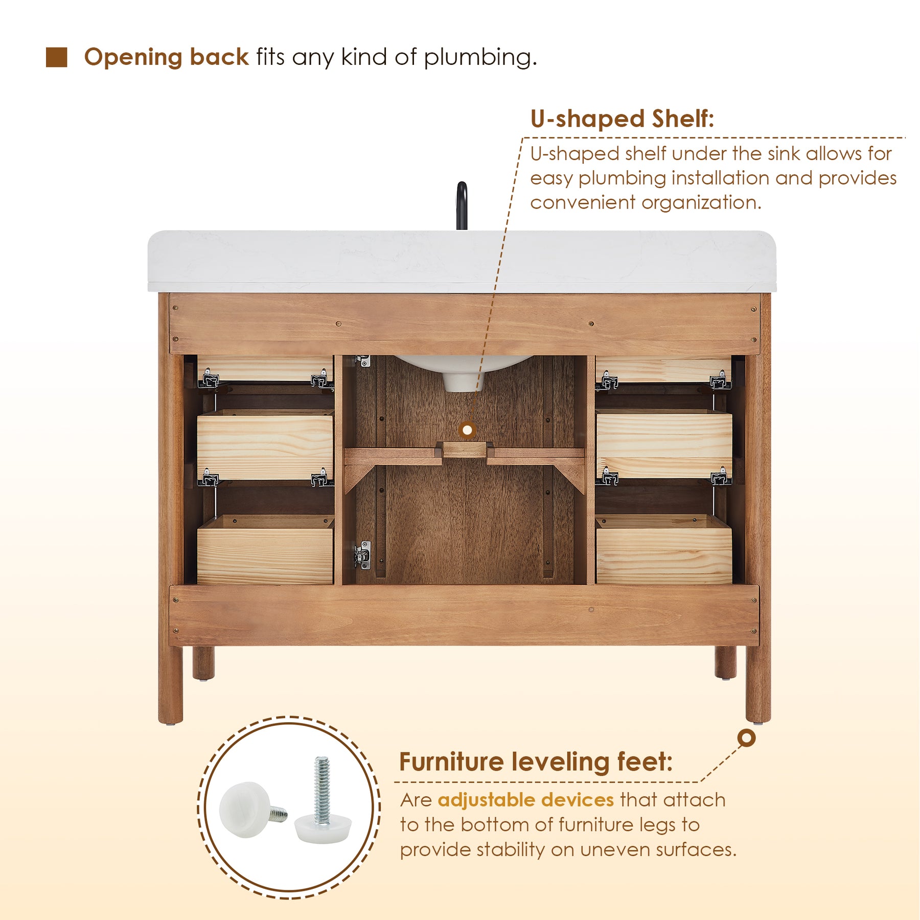 Countertop: Rounded vanity legs: Smooth, rounded cabinet legs ensure stability and durability while adding a subtle touch of classic elegance.