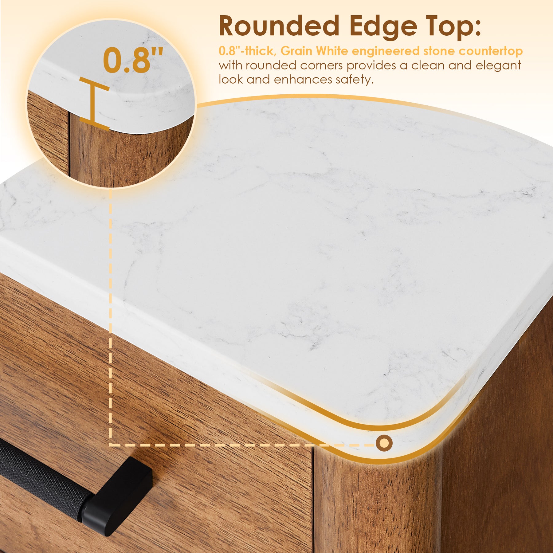 Ceramic Basin: Rounded-edge countertop: 0.8”-thick, Grain White engineered stone countertop with rounded corners provides a clean, high-end look while enhancing safety. A matching 4” backsplash protects your wall from sink splashes.