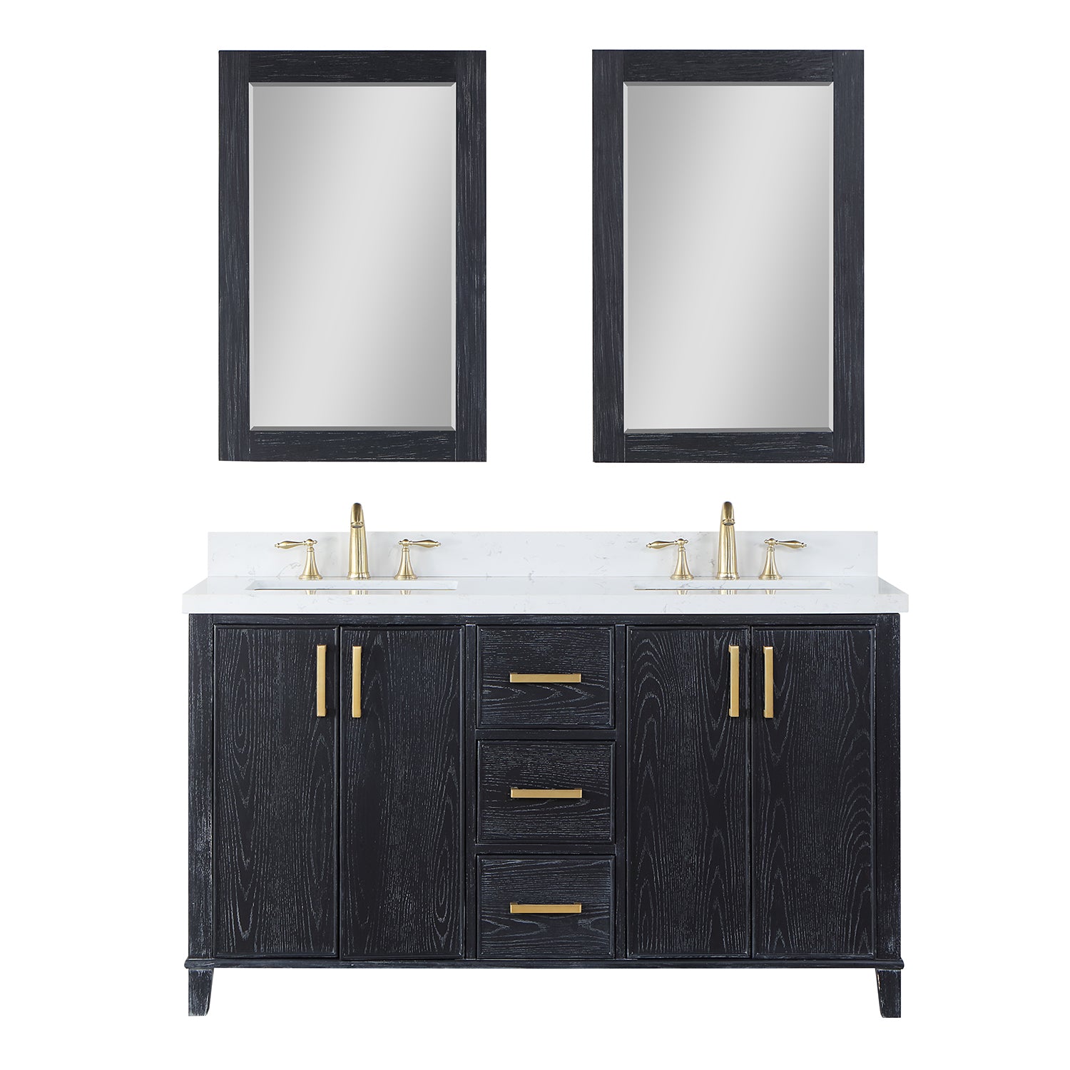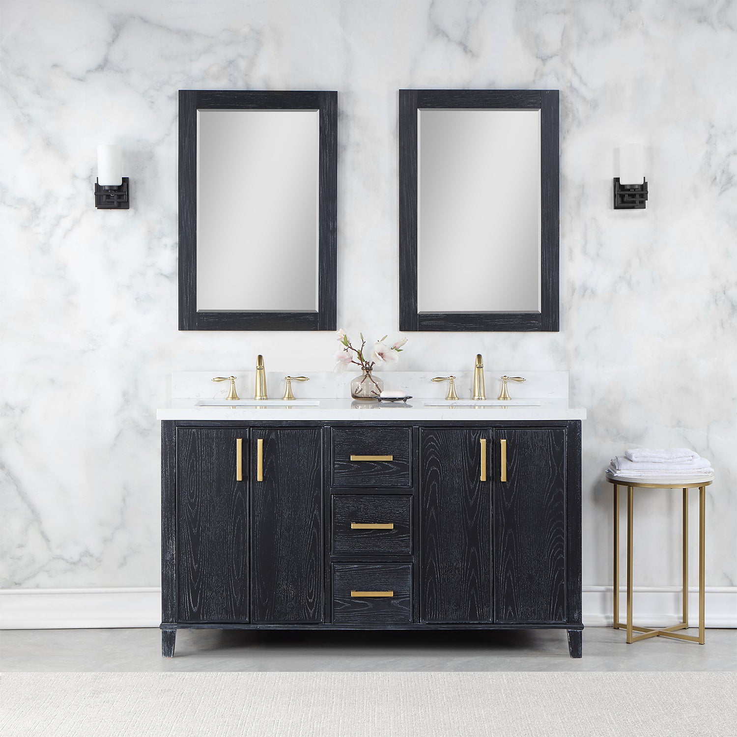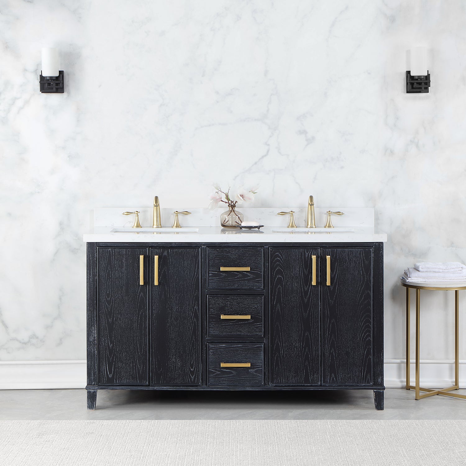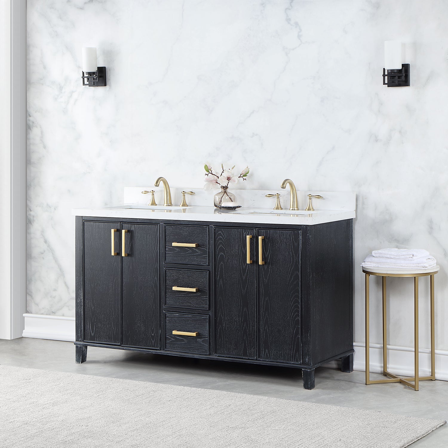 Our Weiser series vanity is masterfully crafted from solid wood and oak veneers and finished in a rich Black Oak color. The bright white, lightly veined Engineered Stone Countertop offers up a stunning contrast against the deep, dramatic shade of the cabinet. As gorgeous as it is, the Weiser is also inherently practical. Its doors and multiple soft-closing drawers conceal ample storage space for towels and toiletries. Brushed Gold hardware lends an opulent accent, with its sleek and modern look.