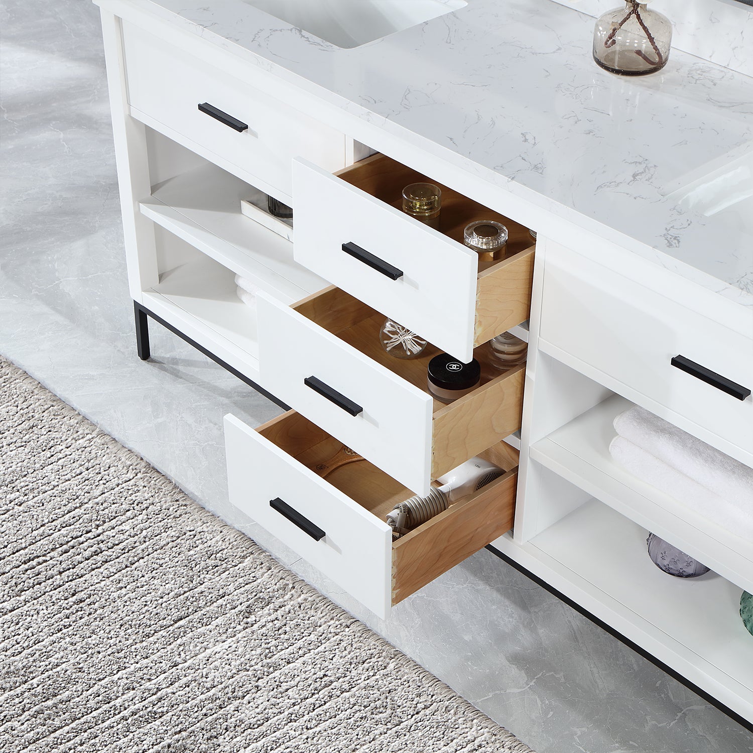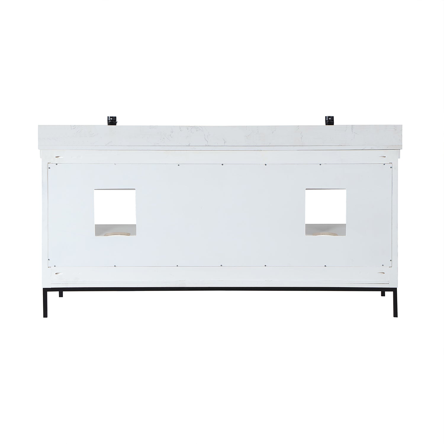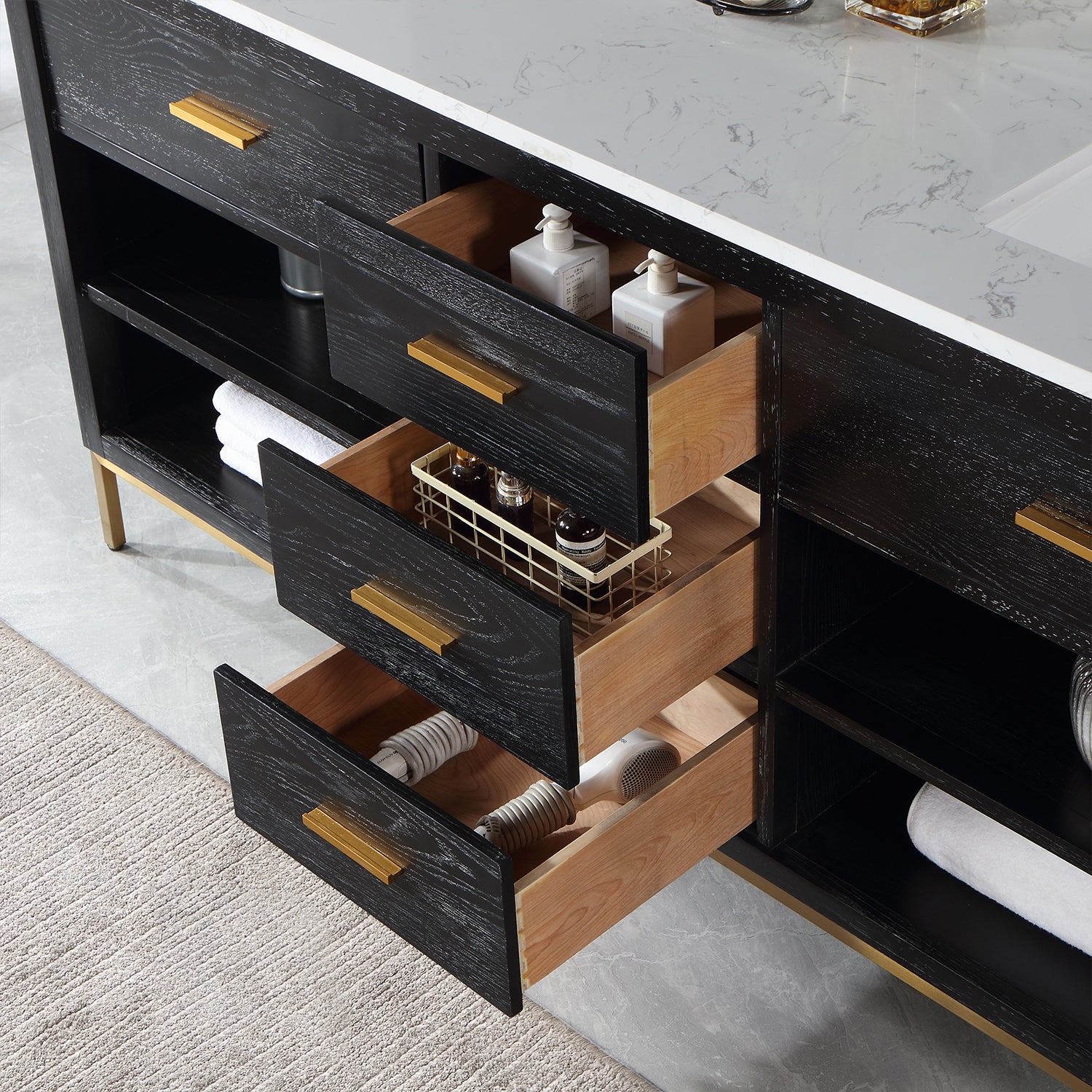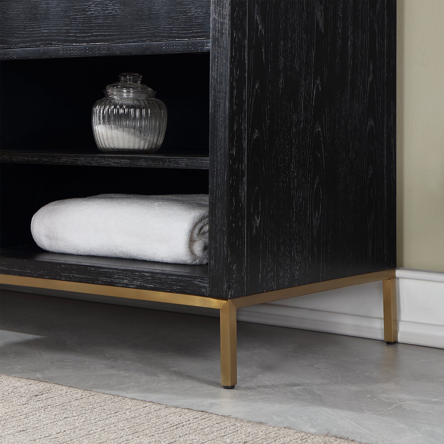 Looking to add style and warmth to your bathroom space? Featuring an exciting blend of textures and storage options, our Wildy Vanity Series embodies a fresh, modern aesthetic with an industrial edge. This piece doesn’t skimp on space, with a roomy main cabinet and full-extension, soft-closing drawers atop an open metal frame. A bottom open shelf adds optional storage or display space for luxury towels. The cabinet is adorned with a solid Engineered Stone Countertop featuring exquisite marbling and an easy-to-clean surface.