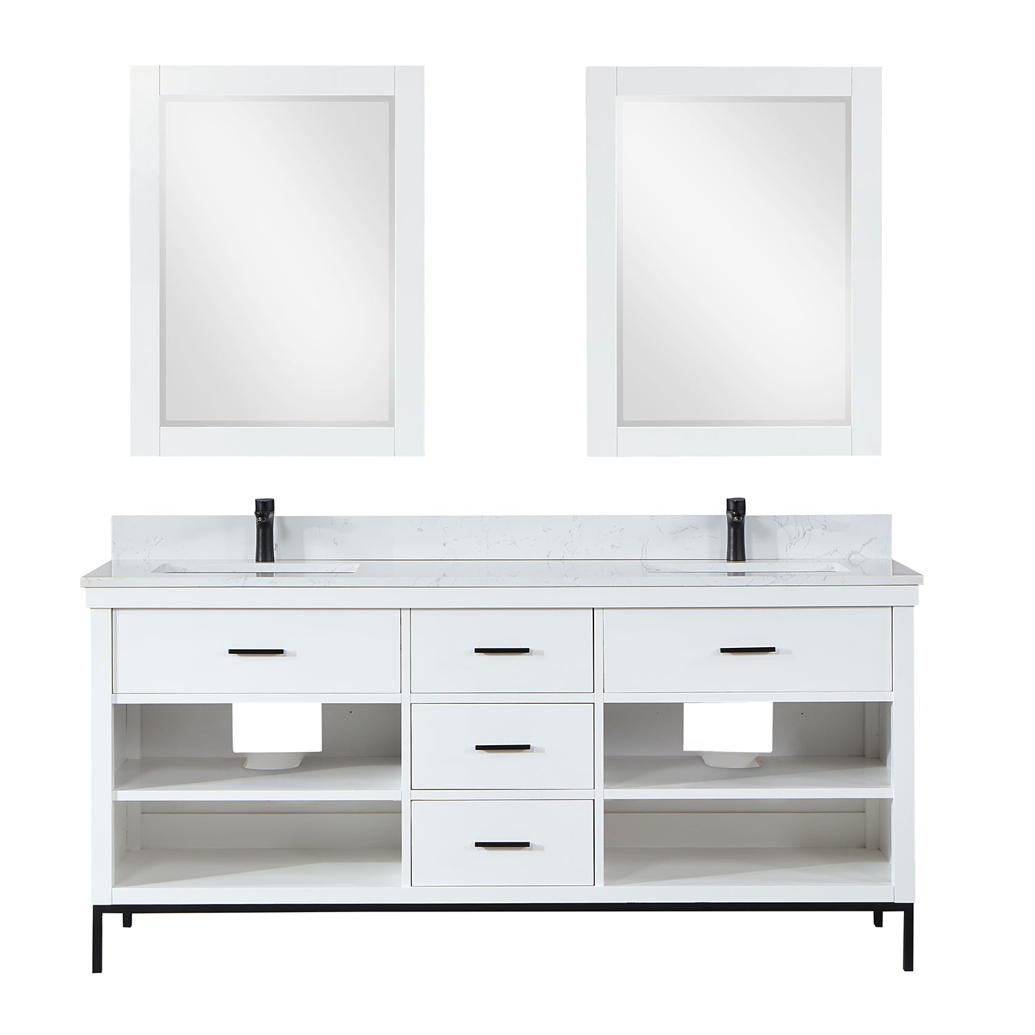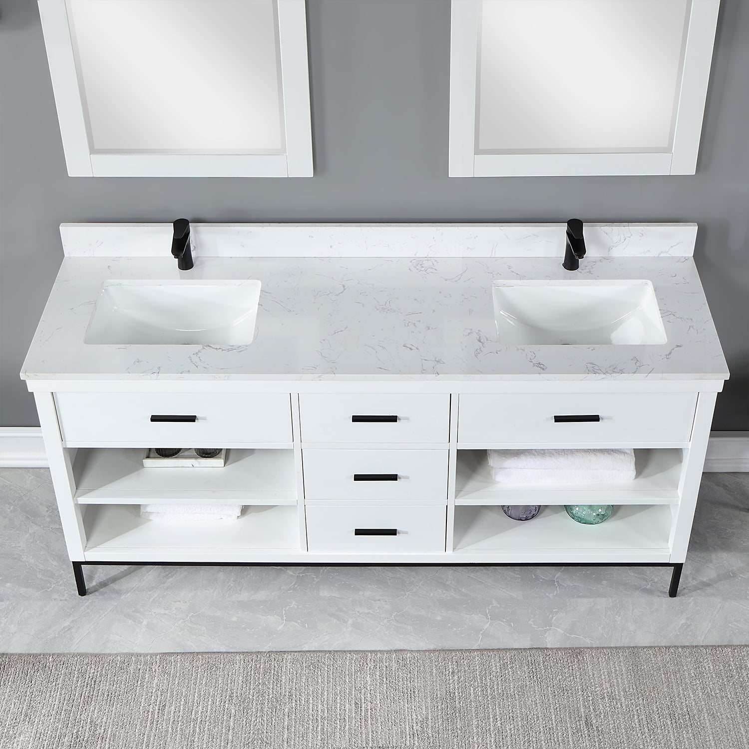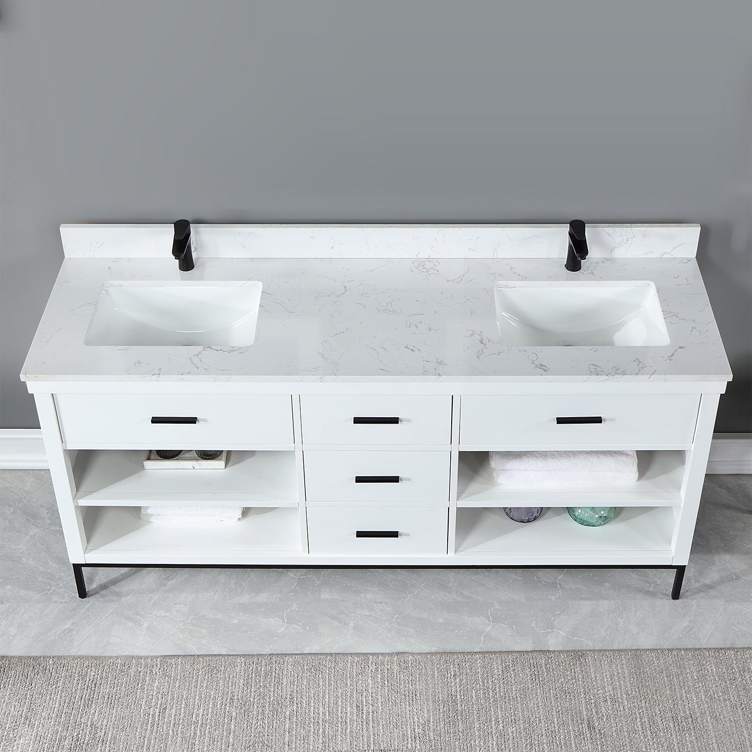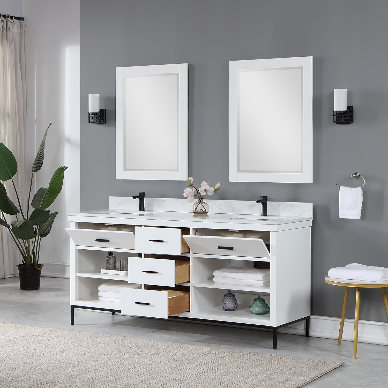 Looking to add style and warmth to your bathroom space? Featuring an exciting blend of textures and storage options, our Wildy Vanity Series embodies a fresh, modern aesthetic with an industrial edge. This piece doesn’t skimp on space, with a roomy main cabinet and full-extension, soft-closing drawers atop an open metal frame. A bottom open shelf adds optional storage or display space for luxury towels. The cabinet is adorned with a solid Engineered Stone Countertop featuring exquisite marbling and an easy-to-clean surface.