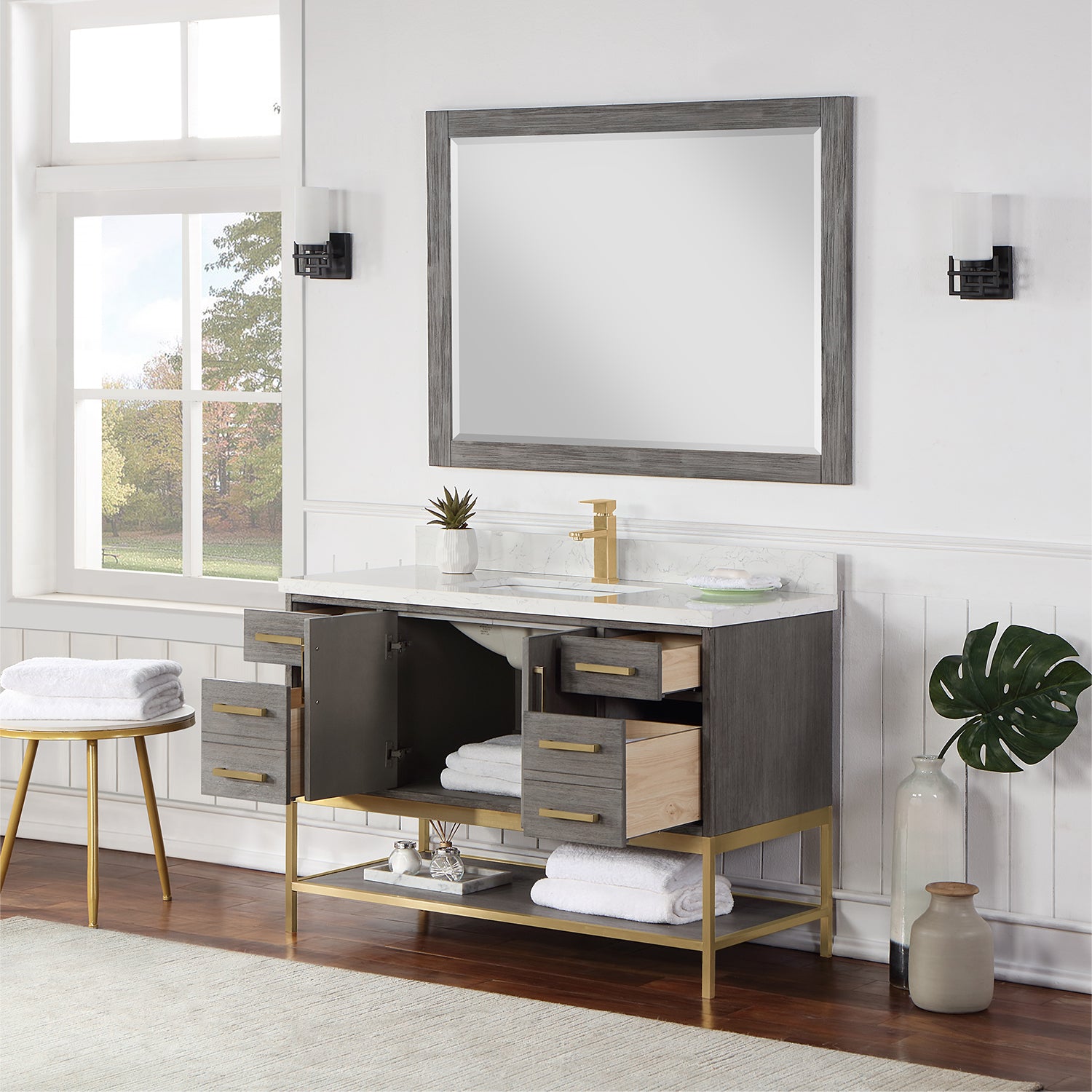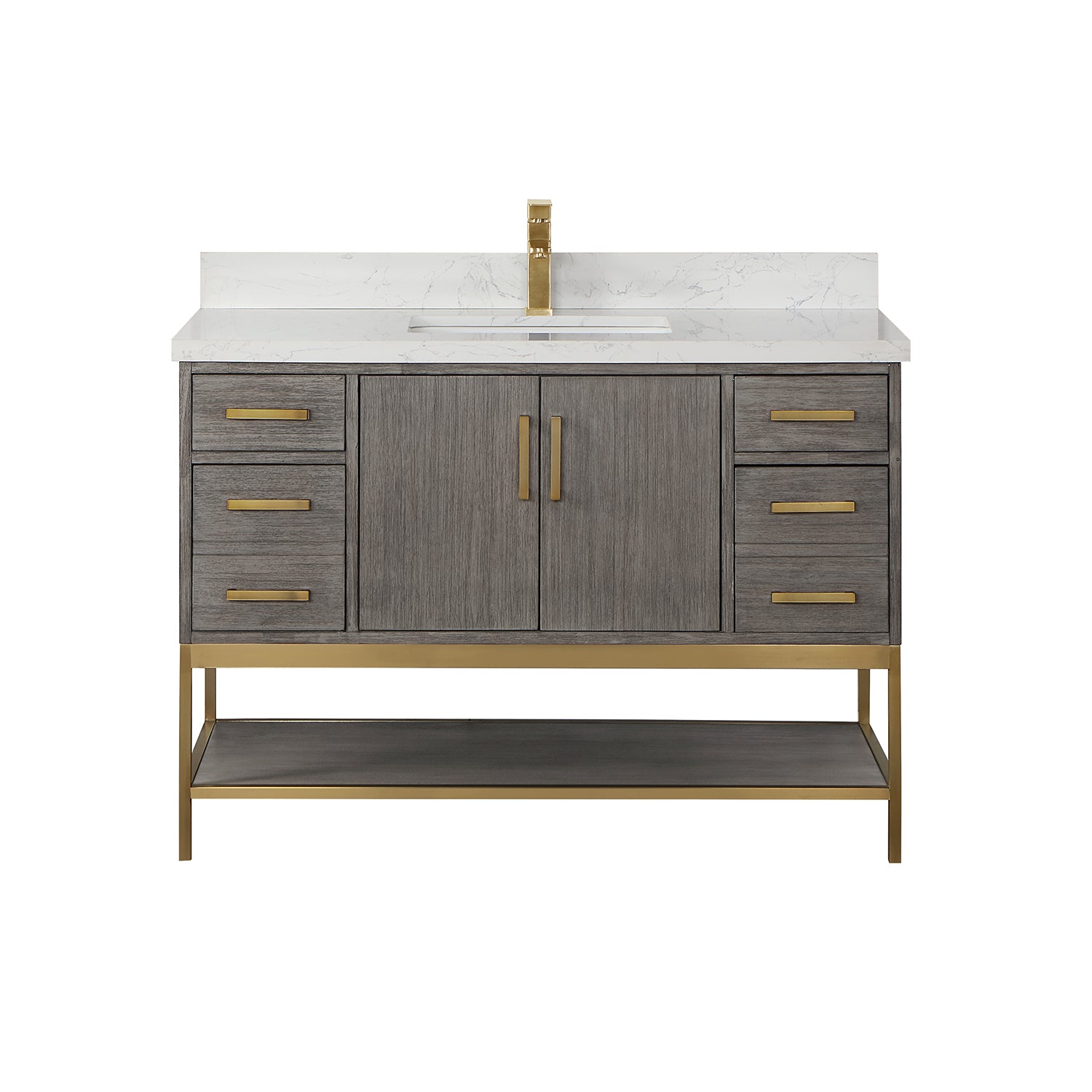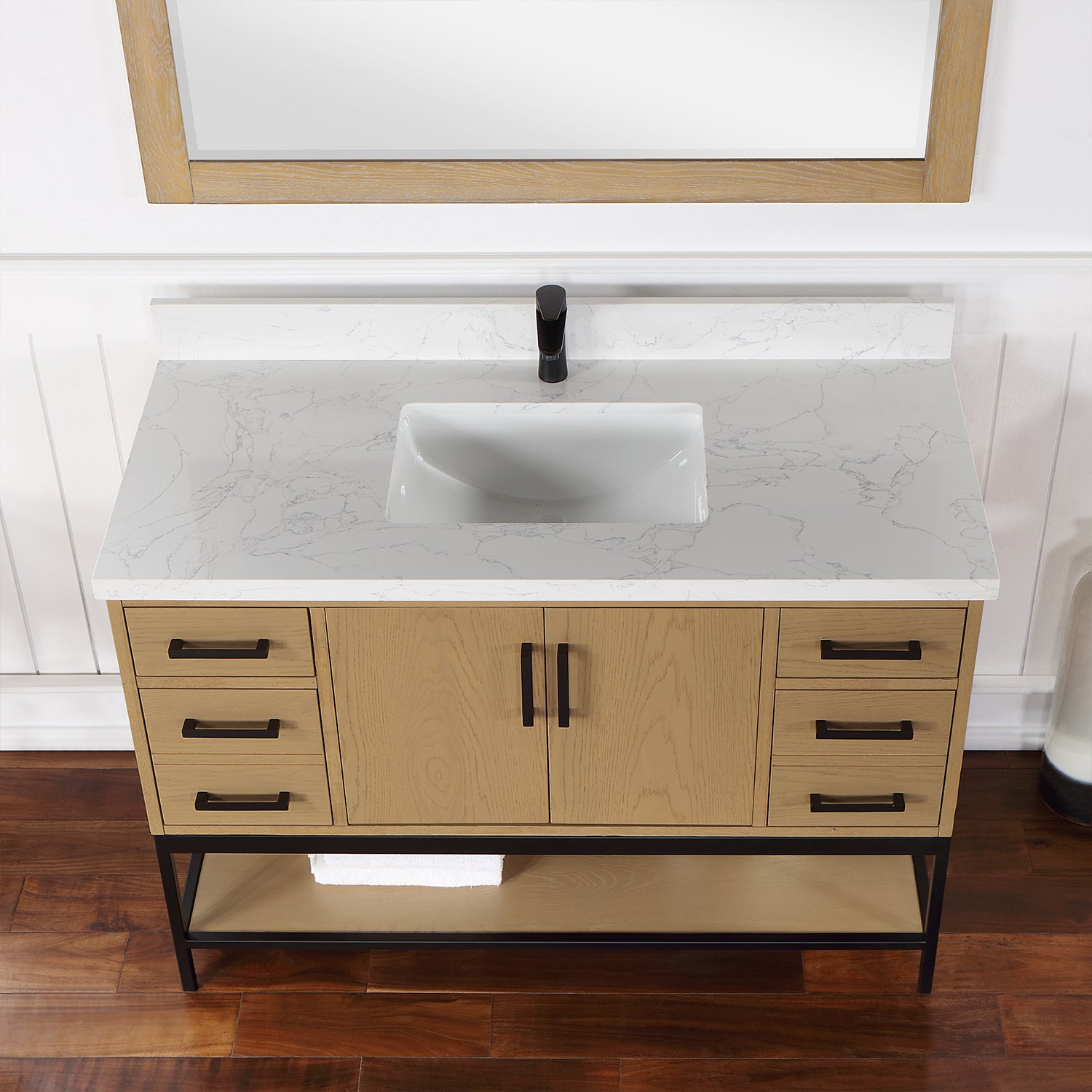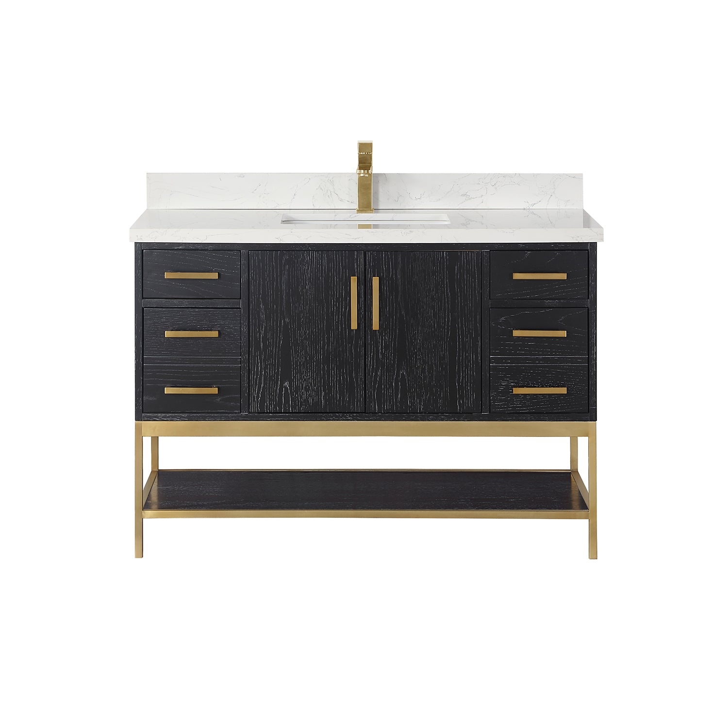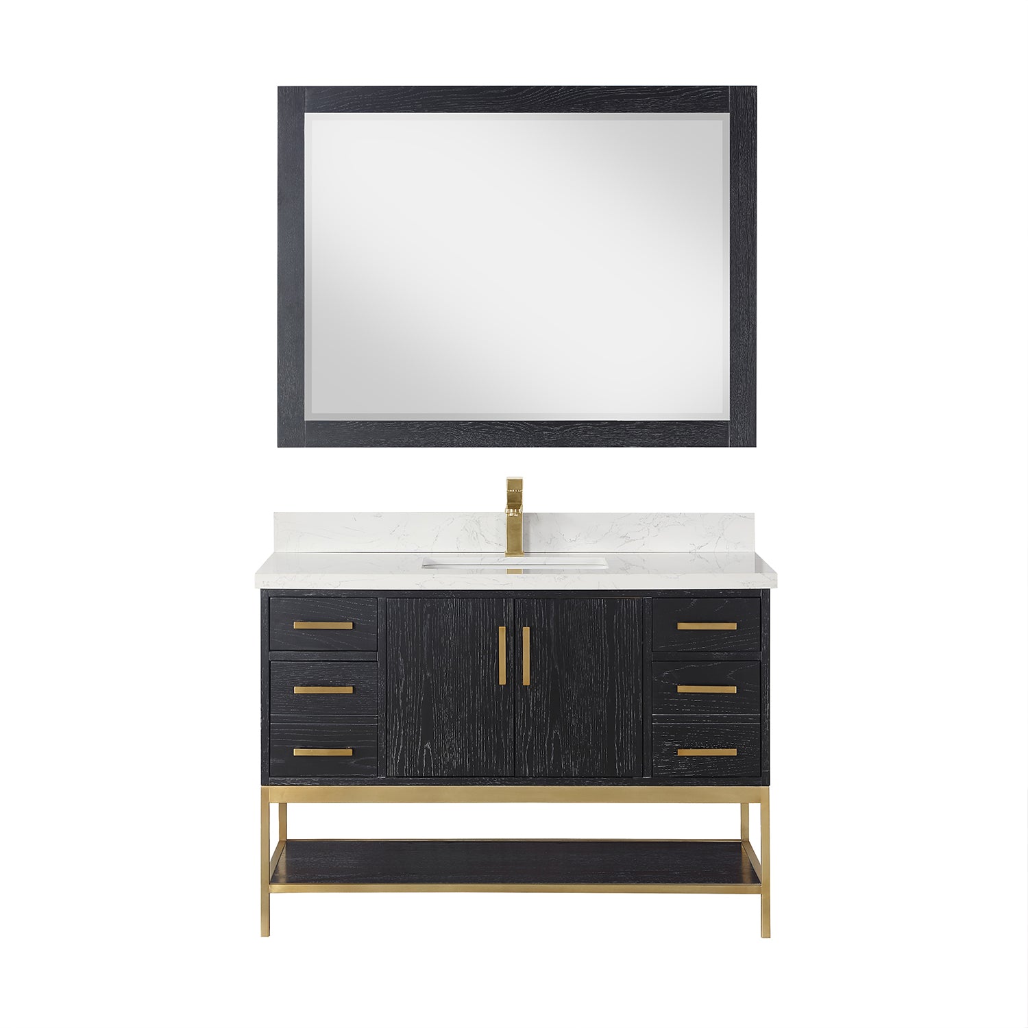 Looking to add style and warmth to your bathroom space? Featuring an exciting blend of textures and storage options, our Wildy Vanity Series embodies a fresh, modern aesthetic with an industrial edge. This piece doesn’t skimp on space, with a roomy main cabinet and full-extension, soft-closing drawers atop an open metal frame. A bottom open shelf adds optional storage or display space for luxury towels. The cabinet is adorned with a solid Engineered Stone Countertop featuring exquisite marbling and an easy-to-clean surface.