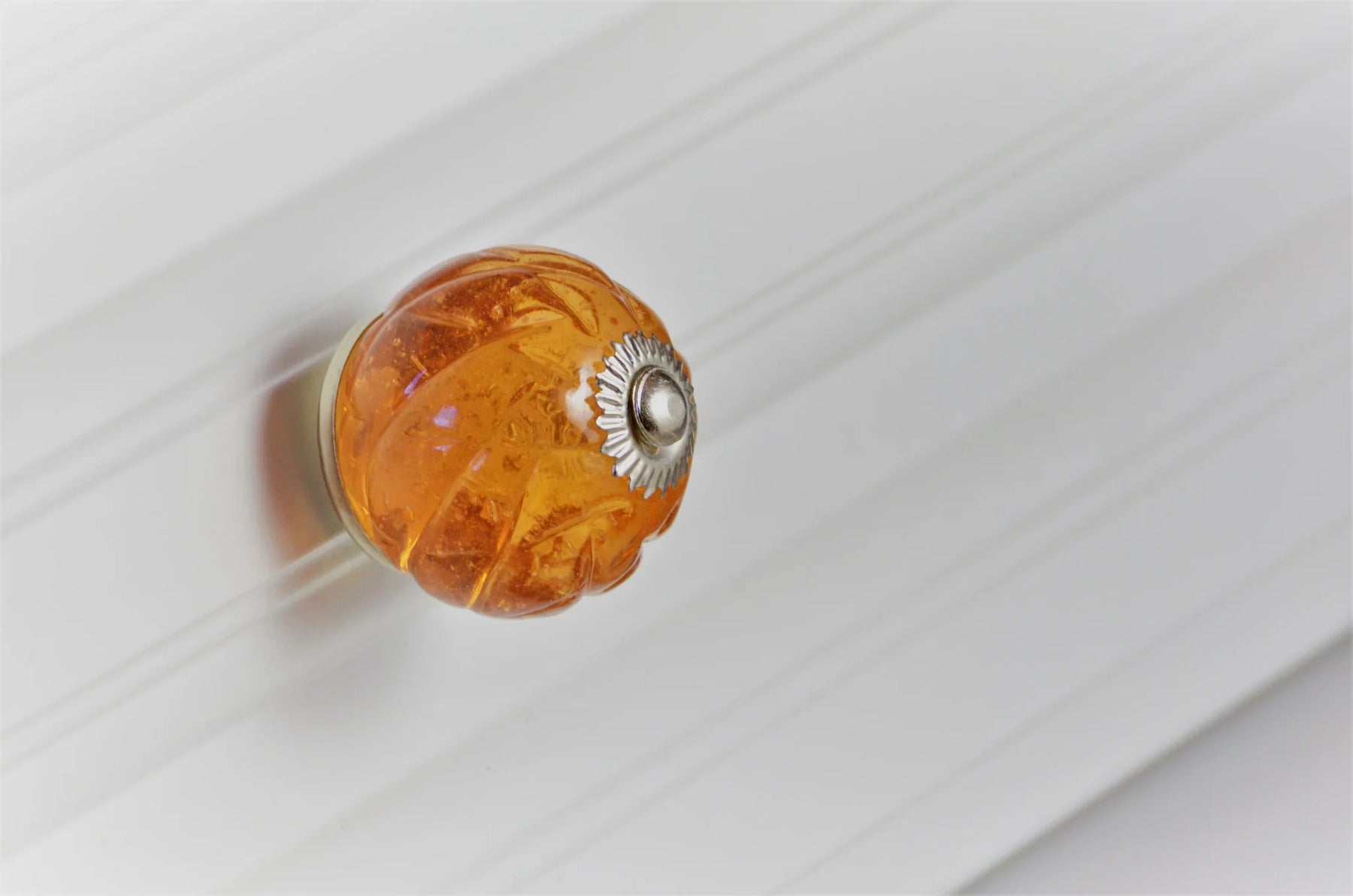 Introducing the Crystal Glass Handcrafted Knob in Amber, (also available in Olive Green, Aqua Blue, Honey, Pink, and Amber variations). This exquisite knob is crafted from crystal glass, offering a luxurious and elegant touch to cabinets, drawers, or furniture. Perfect for enhancing your decor with its rich color options, each knob is handcrafted to ensure uniqueness and quality. Elevate your living spaces with these stunning knobs that combine beauty with functionality, ideal for those seeking to add a touch of sophistication and style to their interior design.